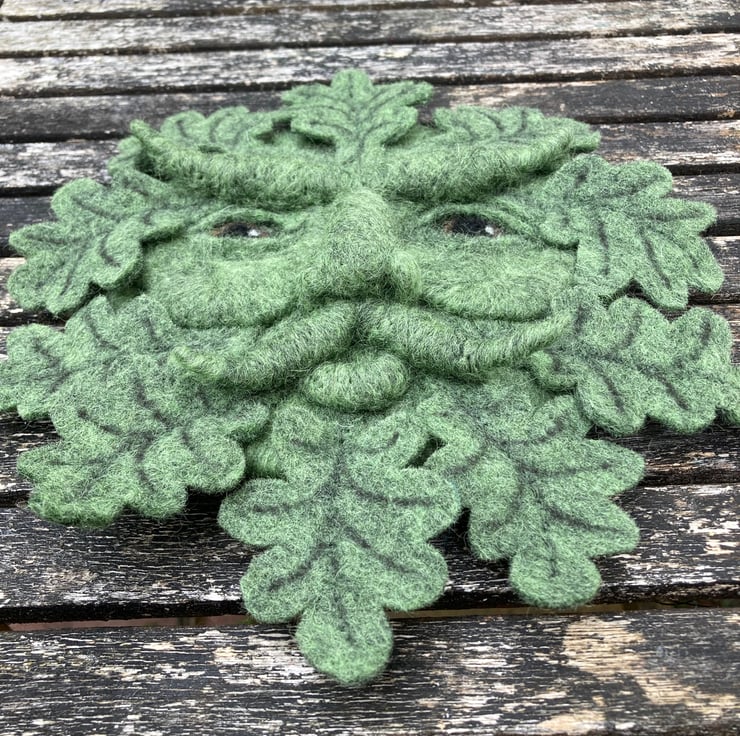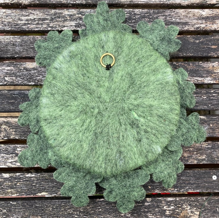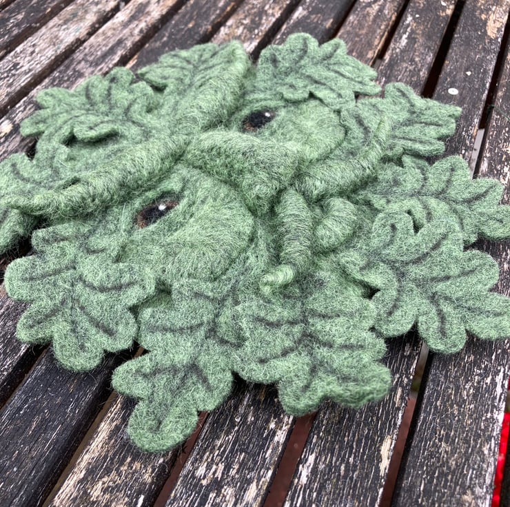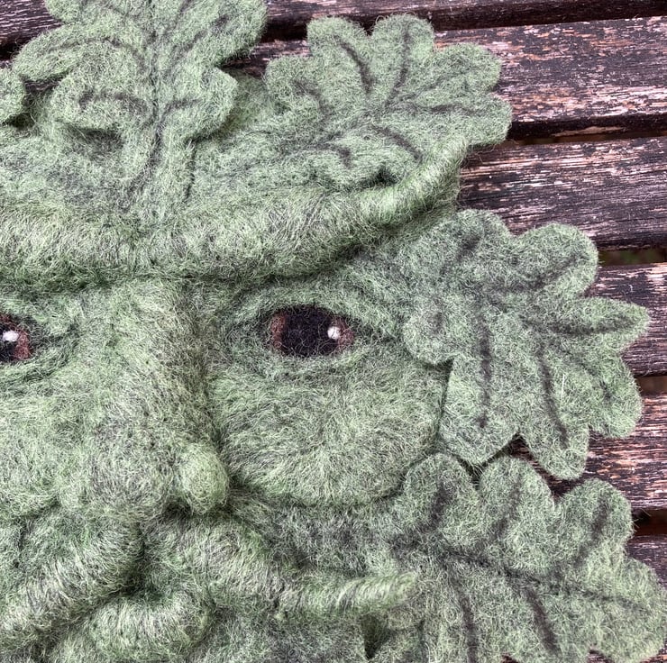The base and features for this green man have been needle felted using woollen fibres sculpted into shape with a barbed felting needle. The oak leaves have been cut from a piece of wet felted hand made green felt.The markings have been added and they have then been attached around the circumference of the base by needle felting them into position. A small brass ring has been secured to the reverse of the sculpture to facilitate hanging.
