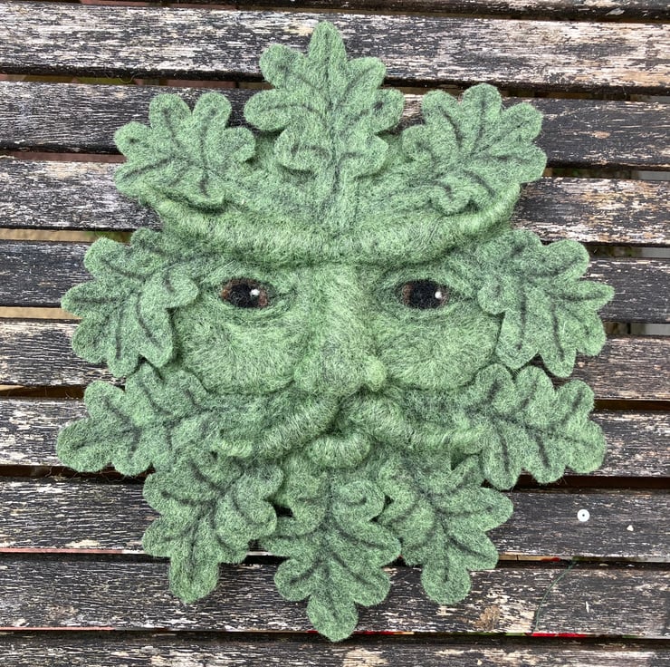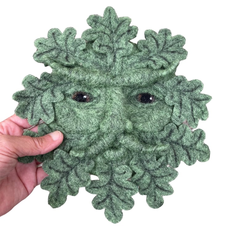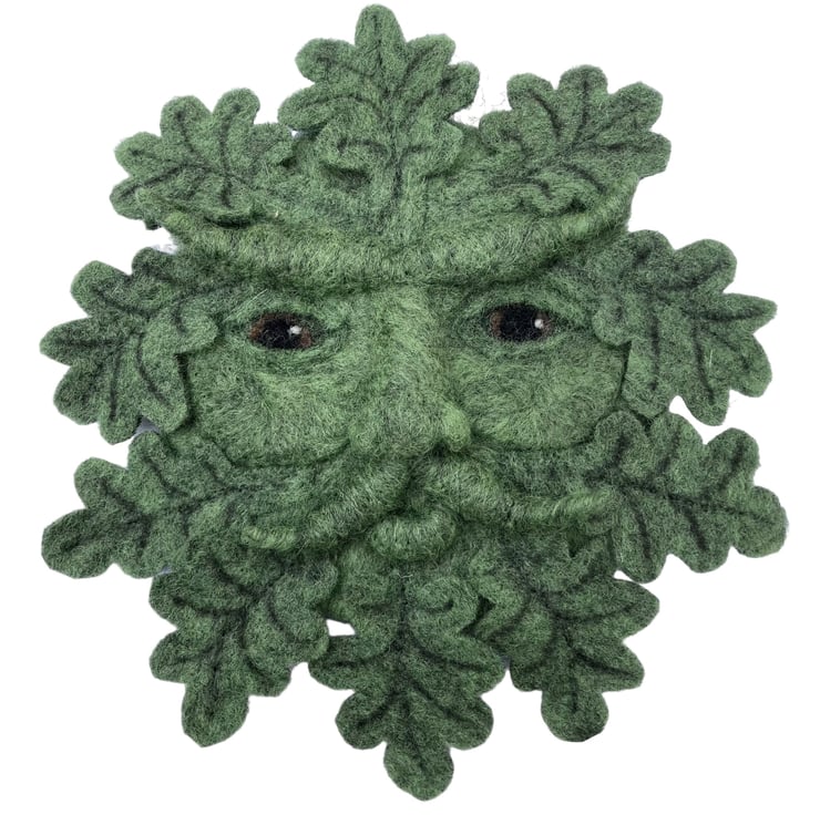 This handsome green man is a needle felted woollen sculpture. The green man is traditionally thought of as a symbol for rebirth and is a popular wall decoration.