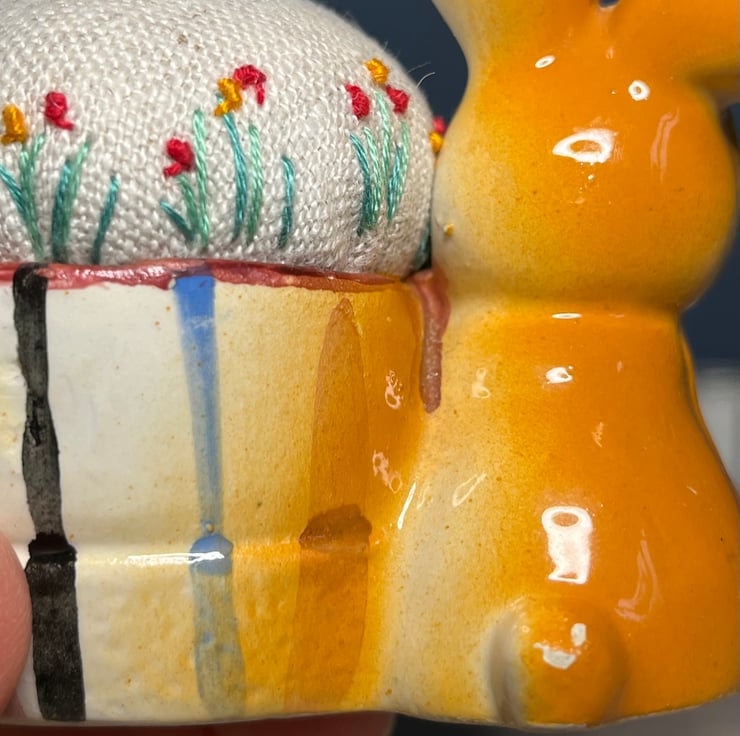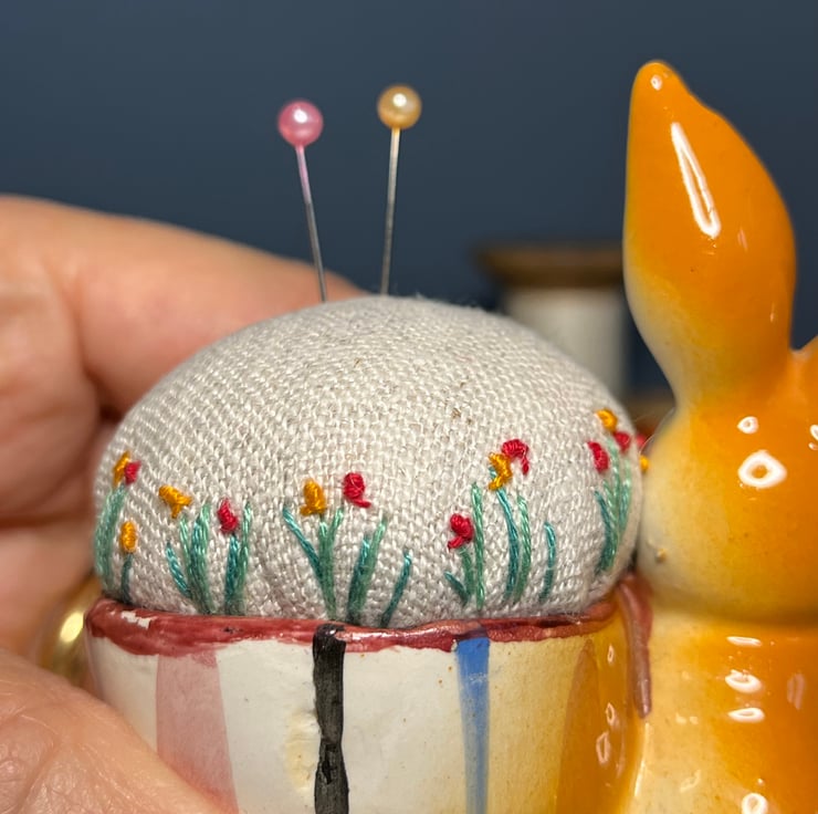 Cute embroidered pincushion in a vintage rabbit egg cup. The reclaimed linen cushion has been embroidered with tiny flowers and a bee.