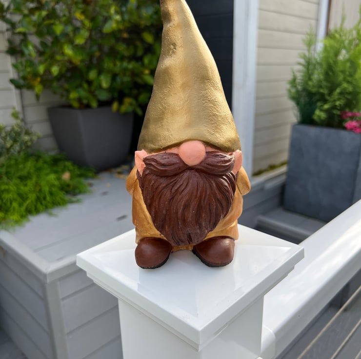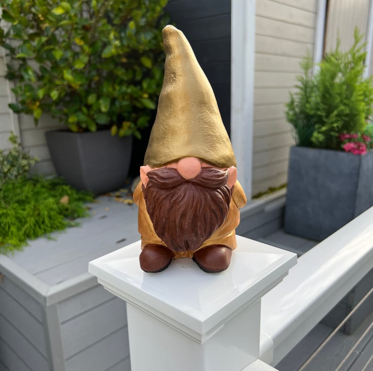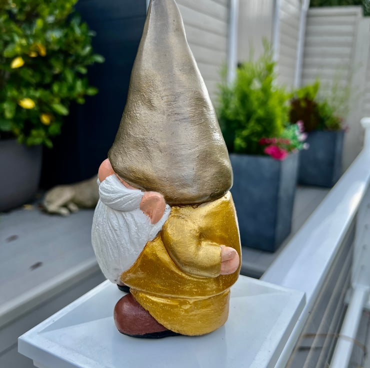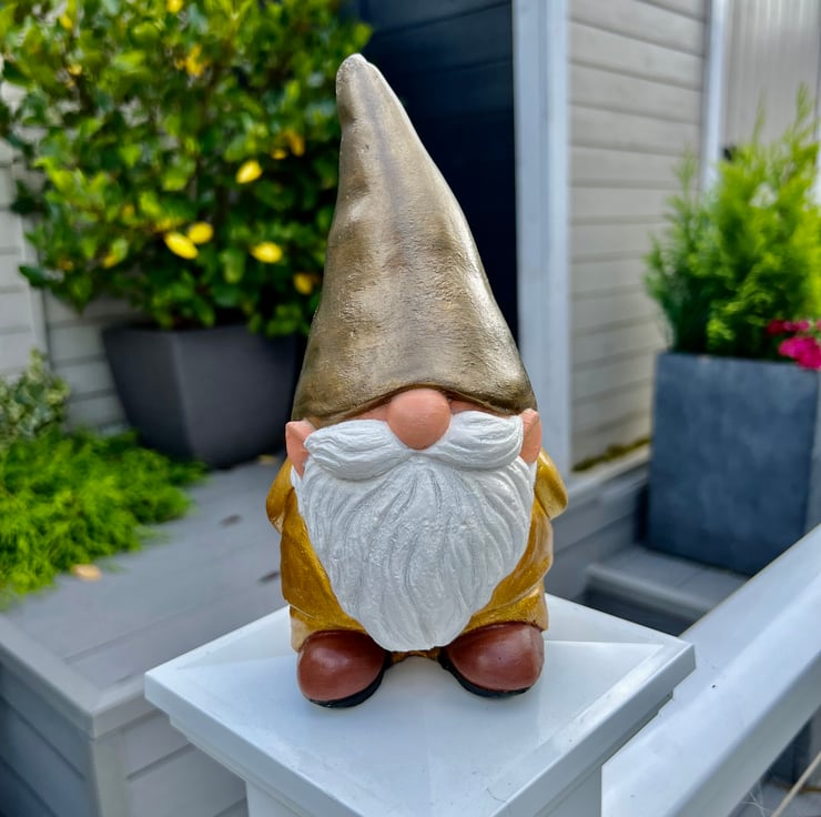 Add some glamour to your garden with this painted concrete gnome. With his gold suit and bronze hat. I can change the skin stone and beard colour, just message me.