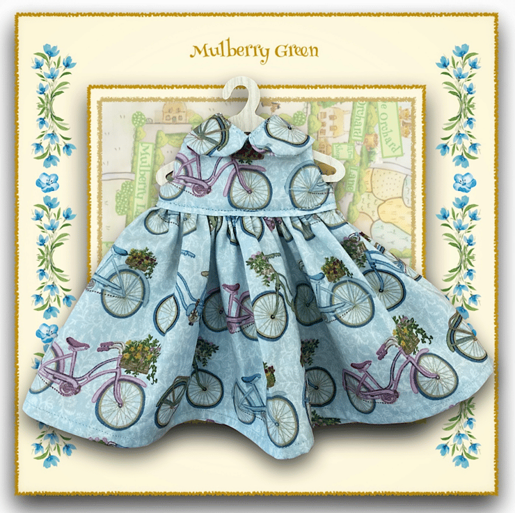 A cute little turquoise dress in a floral bicycle print to fit the Mulberry Green characters. The dress is made from best quality cotton and has a Peter Pan collar and a lined bodice.