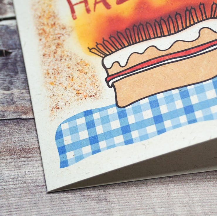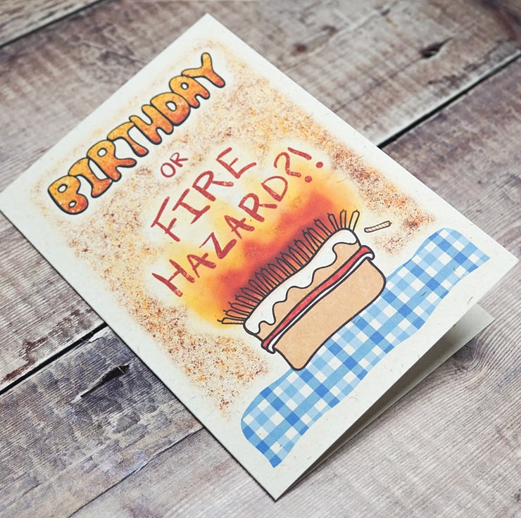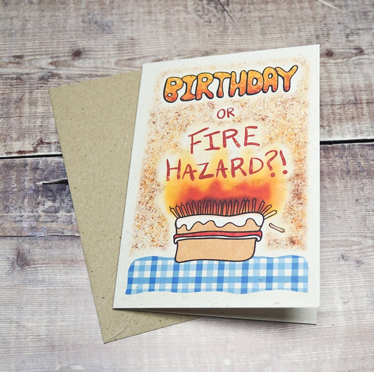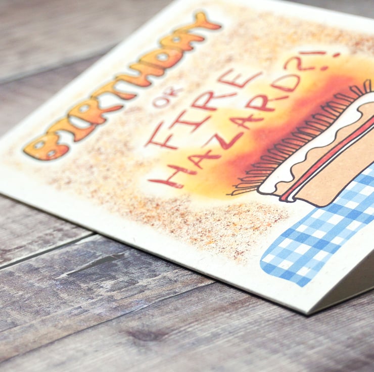 "Birthday...or Fire Hazard???" is the message on the front of the card, with an illustration underneath of a birthday cake that is very much aflame. On a gingham tablecloth because we're civilised like that.