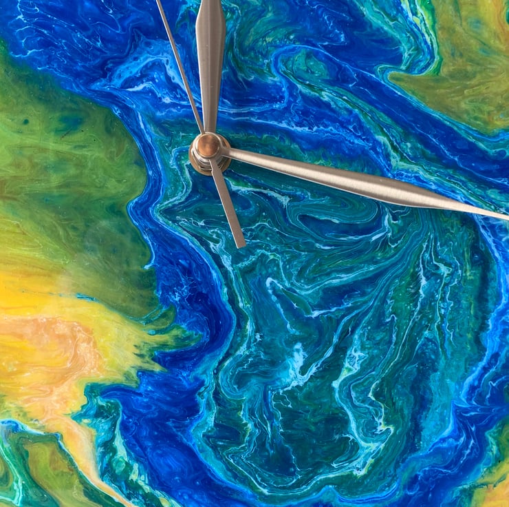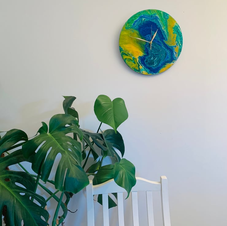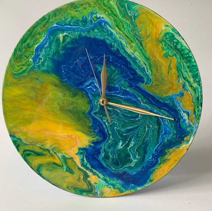 An original 30cm wall clock, upcycled from a vinyl record. Painted and varnished with quality materials and finished with a felt backing for a clean look. It has a quartz mechanism (ticking) and gold coloured hands. It requires 1 AA battery. Free postage for UK buyers and reduced postage for USA