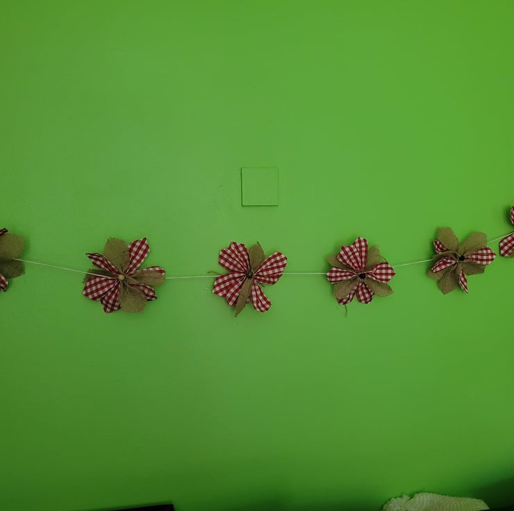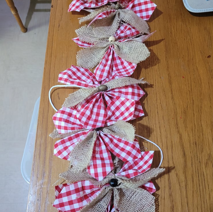 barn dance chic rustic bunting. Made with a combination of natural hessian and red gingham. Measures 6ft long and has 7 7inch flowers each one finished off with a wooden bead in the centre. The flowers can be easily moved along the cord to adjust spacing.