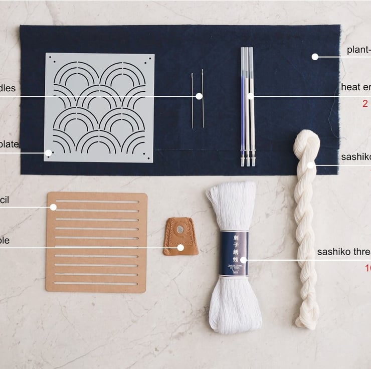This sashiko kit contains everything you need to start a sashiko project. With the general amount of thread supplied and the premium quality of the needles, thimble, and stencils, it will last a long time for many projects.