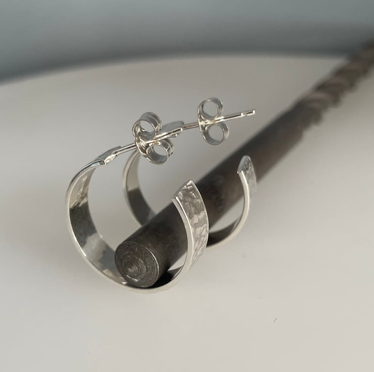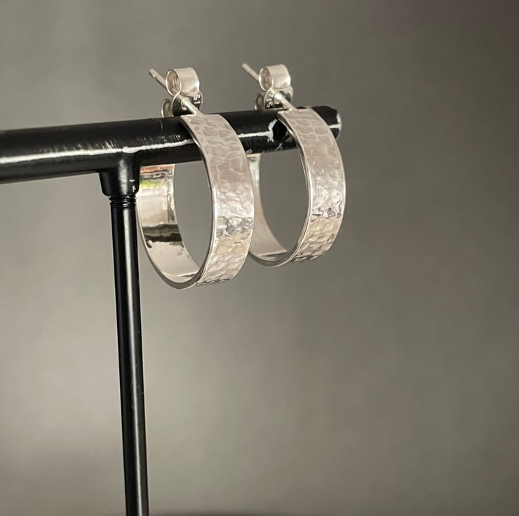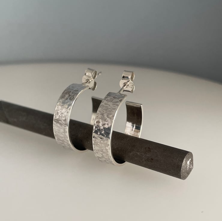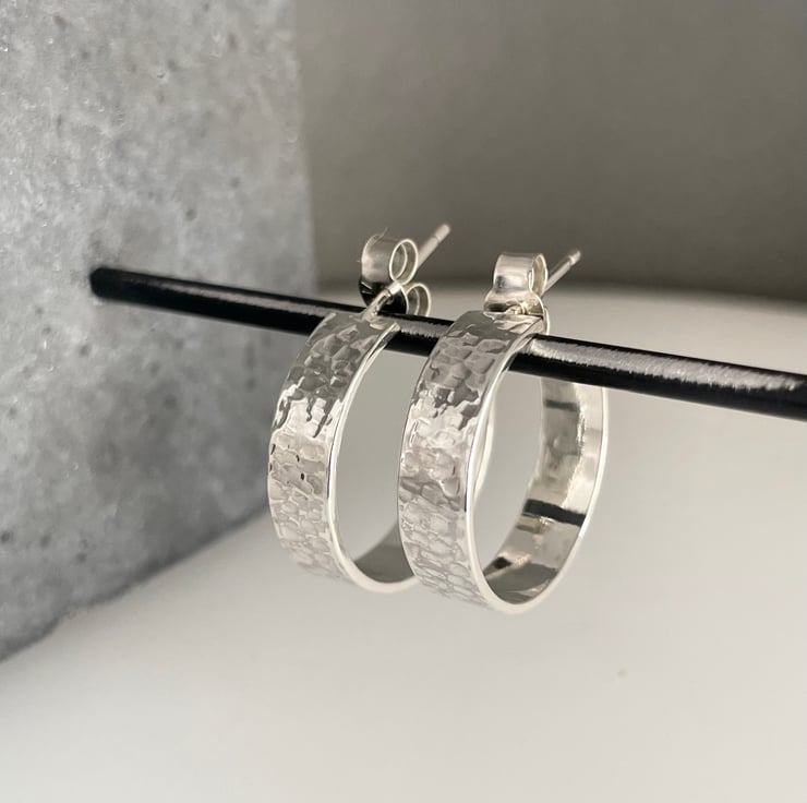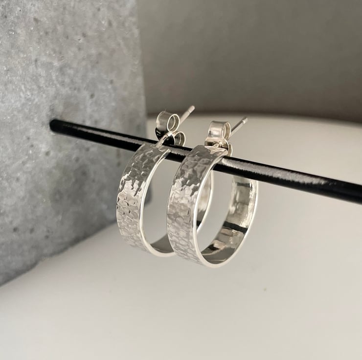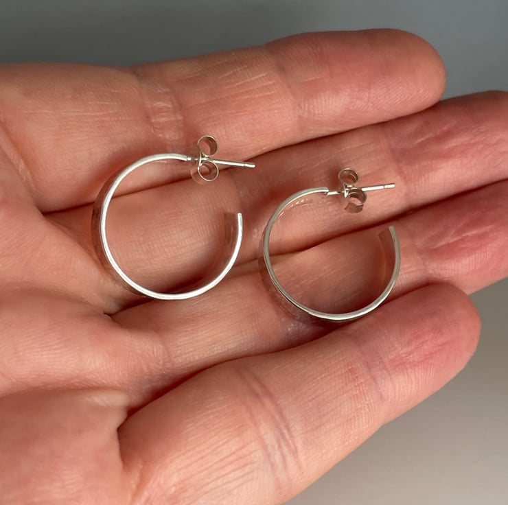 A lovely pair of small classic hoop earrings handmade from 925 sterling sterling silver. Cut by hand from 1mm thick/5mm wide silver rectangular wire, formed into circular shapes then hammered to create an attractive sparkly textured surface.