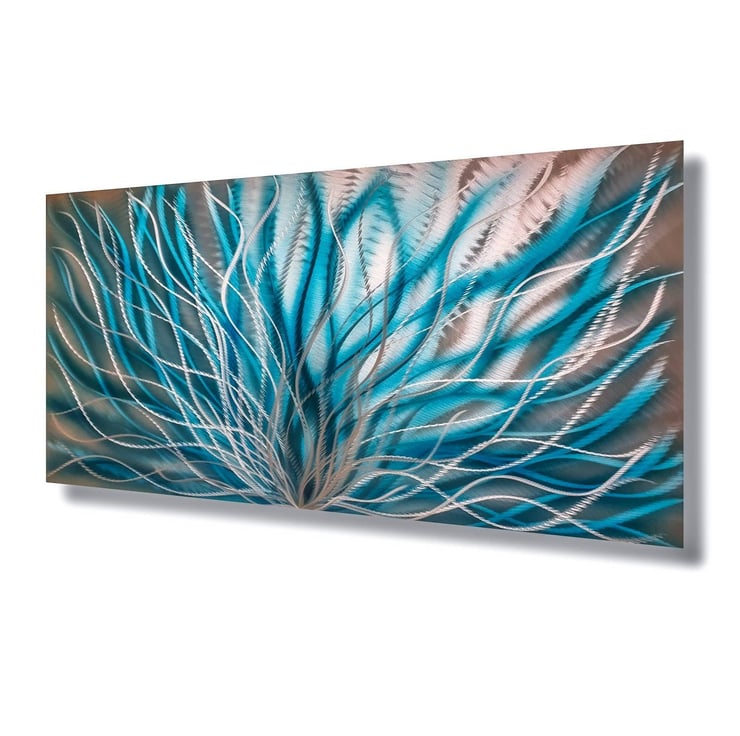 The InBloom teal metal wall art is a contemporary piece created by the talented metal artist Christopher Henderson. It is meticulously handcrafted using high-quality metal materials. The artwork features unique swirl tree-style engravings that give it a visually appealing look. The reflective surface adds depth and dimension, making it suitable for modern decor. The intricate detailing and precise craftsmanship showcase the artist's skill and creativity.