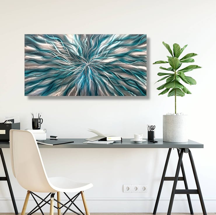 Add a statement to your home decor with this stunning metal wall art piece in teal color. Its unique design is sure to captivate your guests and leave an unforgettable impression. The metal wall sculpture, named "Radiation," is a perfect example of modern art, metal wall art, and wall sculpture. It is made from durable metal materials to last for years to come.