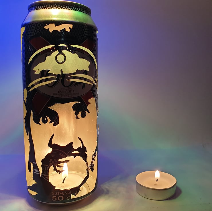 This item is a totally unique, hand-carved beer can featuring a portrait of Mororhead & Hawkwind legend and Rock 'n' Roll icon Lemmy! The effect works by placing a tealight candle inside (the base is cut out so the can fits over it - see vid)) allowing the light to shine through the carving creating this amazing silhouette image which looks very cool in a darkened room... Makes a great one-off gift and a must have for any Lemmy fan!