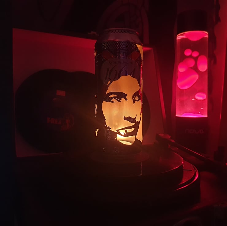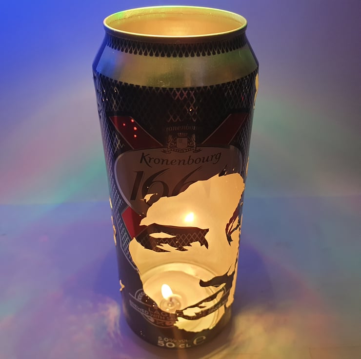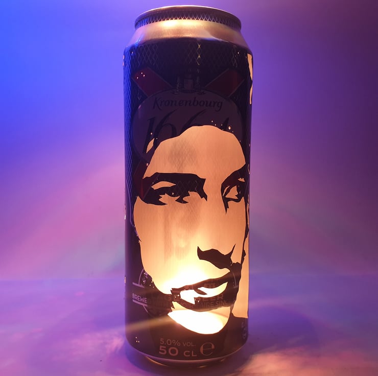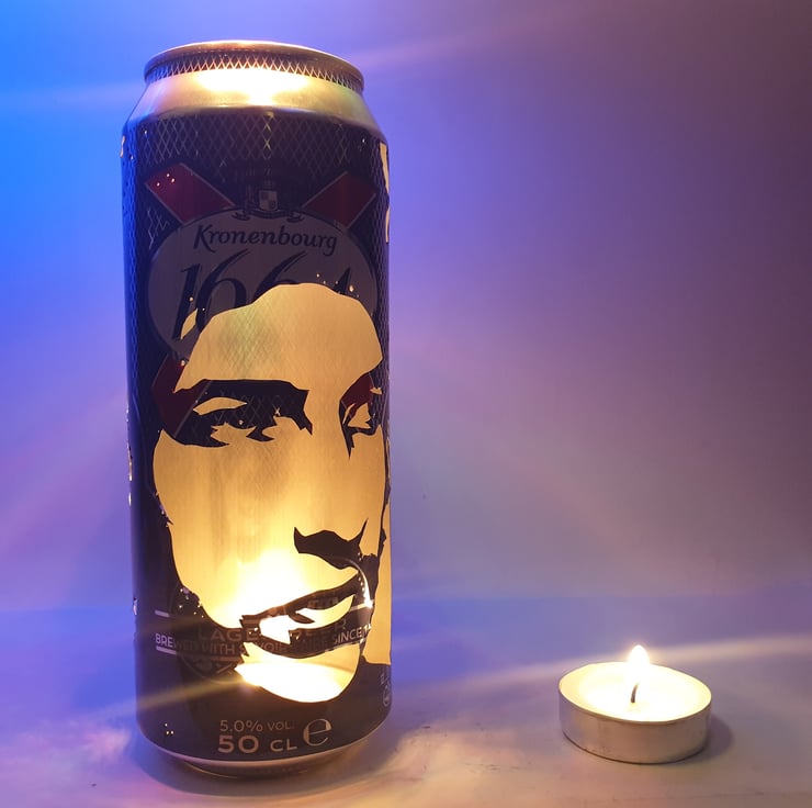 Each piece is a recycled beer can, hand-carved by the artist with a craft knife to create an amazing visual effect. The simple addition of a tealight candle turns each can into a unique portrait lantern featuring a striking silhouette image.