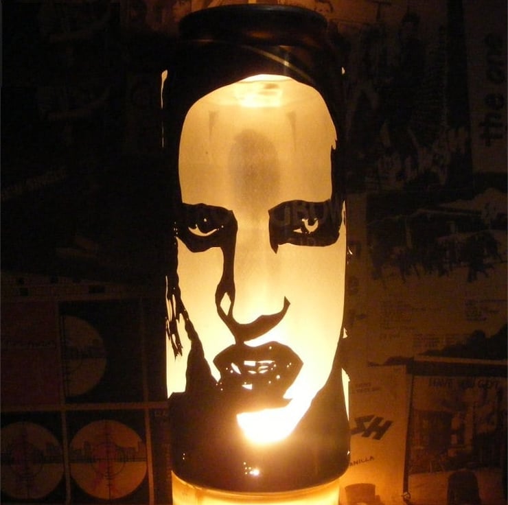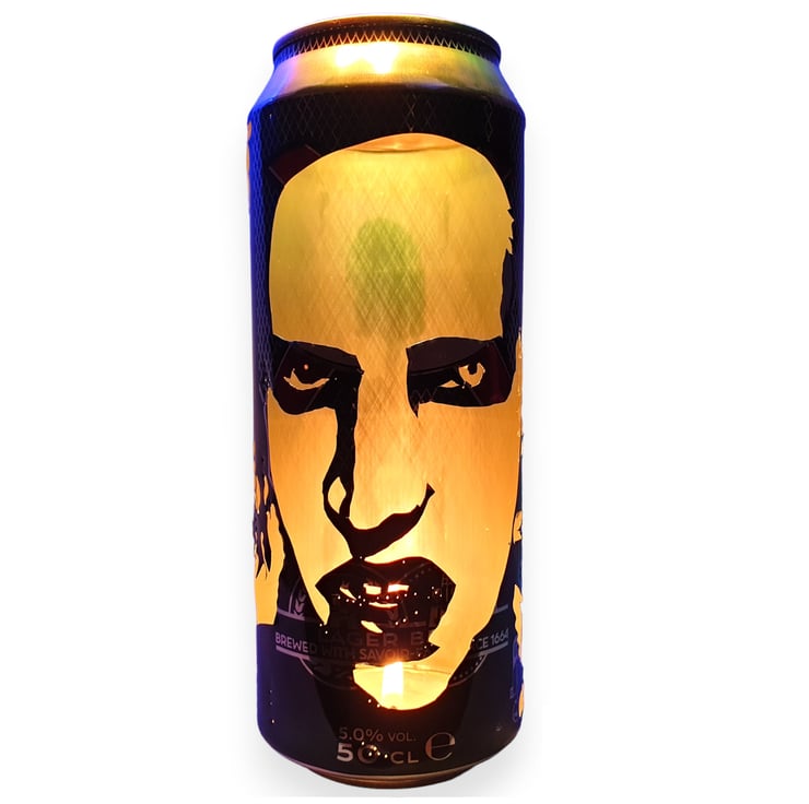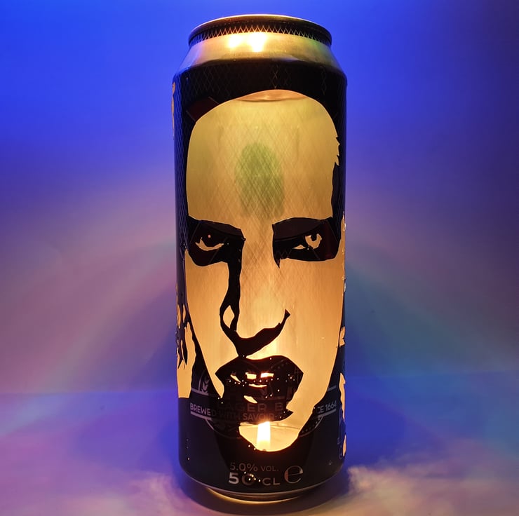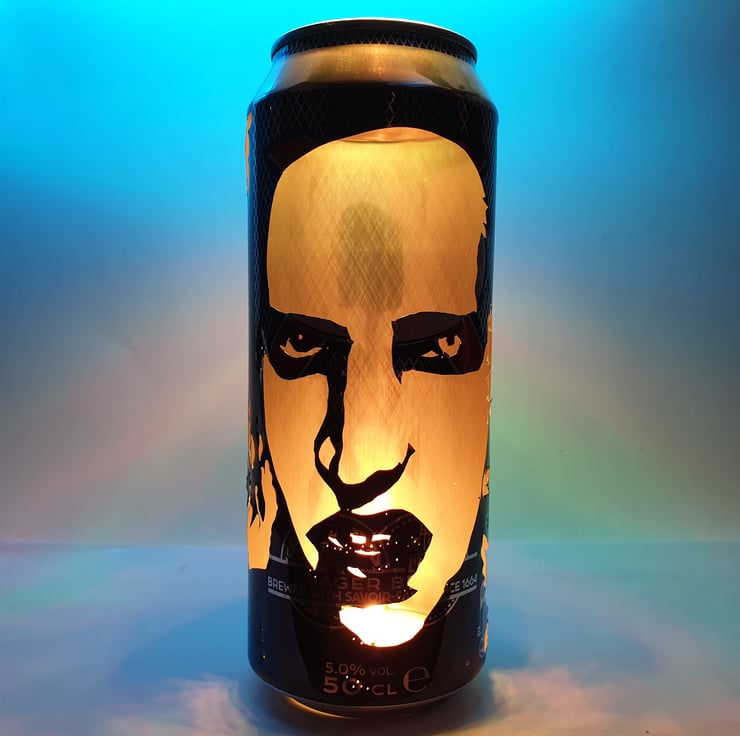 This item is a totally unique, hand-carved beer can featuring a portrait of industrial rock legend Marilyn Manson! The effect works by placing a tealight candle inside (the base is cut out so the can fits over it) allowing the light to shine through the carving creating this amazing silhouette image which looks very cool in a darkened room... Makes a great one-off gift and a must have for any Marilyn fan!
