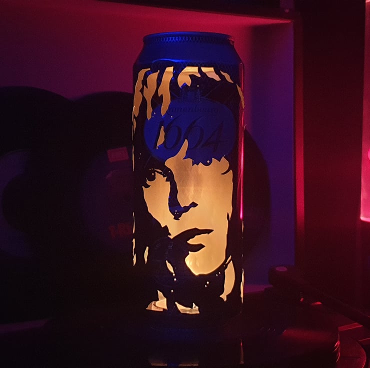 This item is a totally unique, hand-carved beer can featuring a portrait of the Stone Roses legendary frontman. The effect works by placing a tealight candle inside (the base is cut out so the can fits over it) allowing the light to shine through the carving creating this amazing silhouette image which looks very cool in a darkened room... Makes a great one-off gift and a must have for any Roses fan!