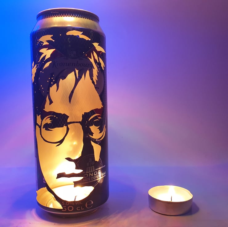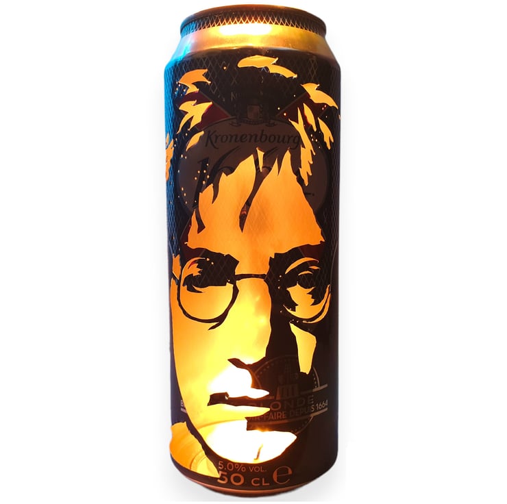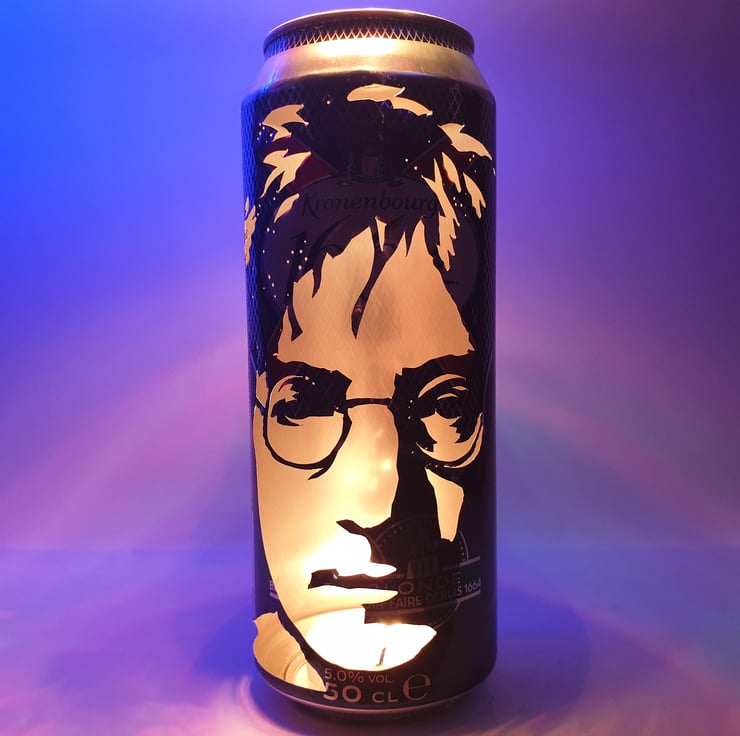 This item is a totally unique, hand-carved beer can featuring a striking image of legendary Beatle John Lennon. The effect works by placing a tealight candle inside (the base is cut out so the can fits over it) allowing the light to shine through the carving creating this amazing silhouette image which looks very cool in a darkened room... Makes a great one-off gift and a must have for any Lennon fan!