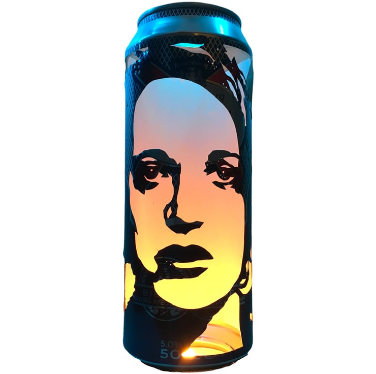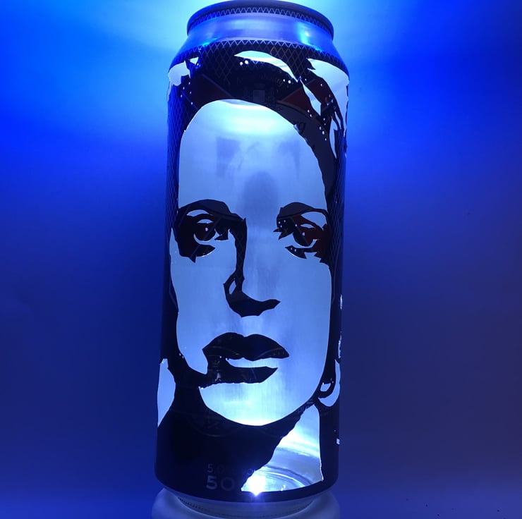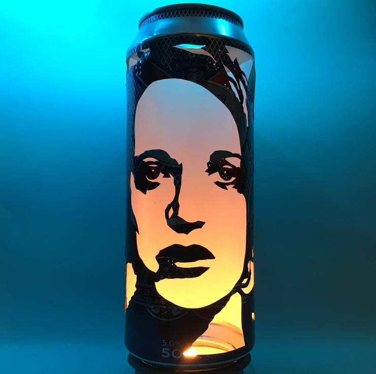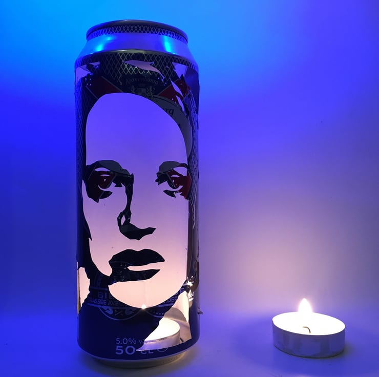 Each piece is a recycled beer can, hand-carved by the artist with a craft knife to create an amazing visual effect. The simple addition of a tealight candle turns each can into a unique portrait lantern featuring a striking silhouette image.