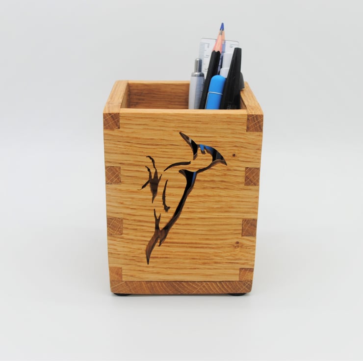 A perfect desk tidy or decorative storage box. Made from solid Oak and finished with Danish Oil which brings out the natural grain of the wood. The box and woodpecker image have been cut with a scroll saw.