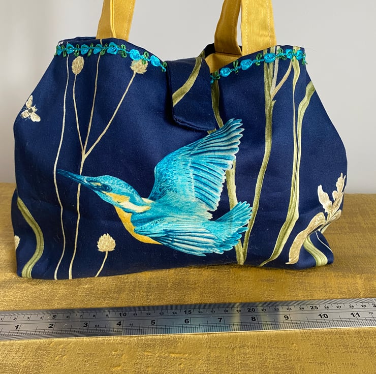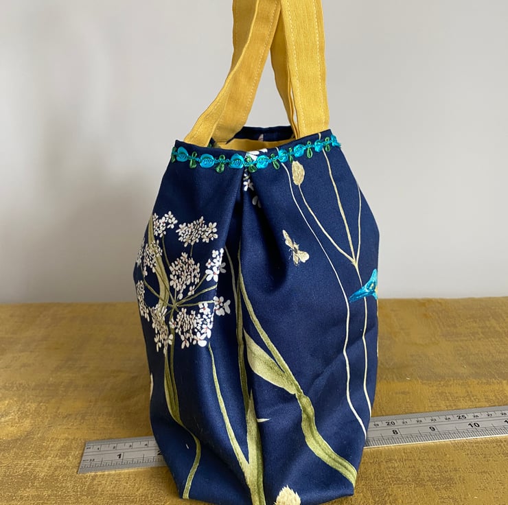 Navy Blue Tote bag in a beautiful fabric designed by Sanderson under licence from the National Trust, called Kingfisher and Iris