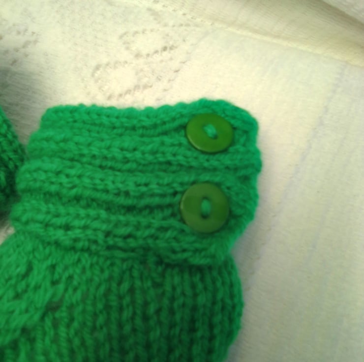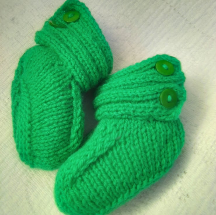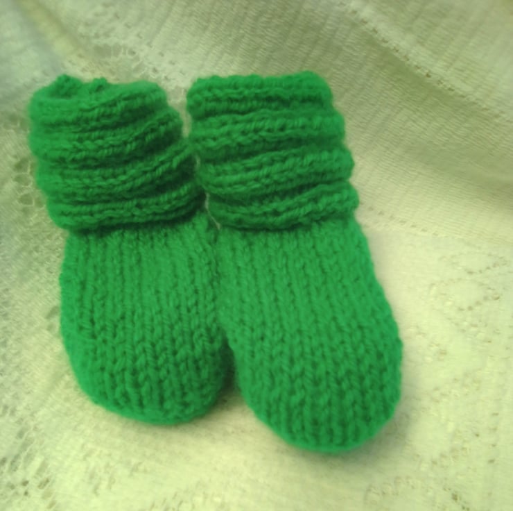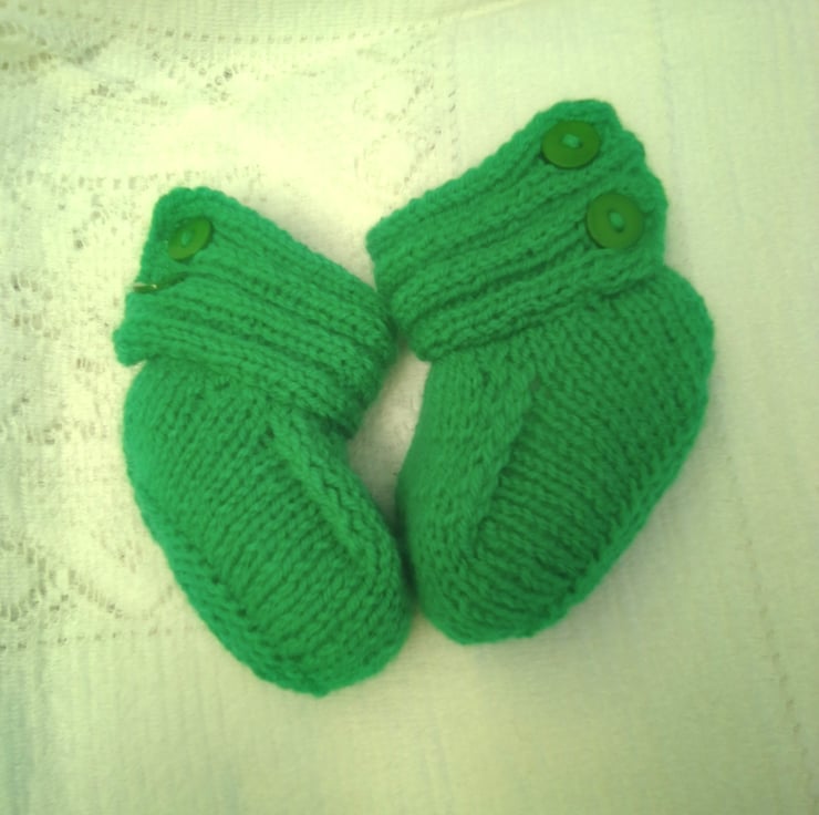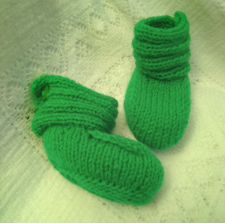 Baby's knitted boots made with double knitting yarn, as shown. The boots are made in the green colour shown to fit a newborn baby. They would make an ideal gift for a birthday, baby shower, new baby or just as something to for your little ones to wear.