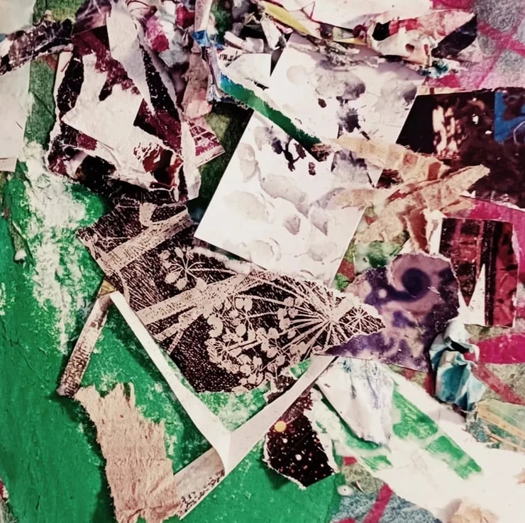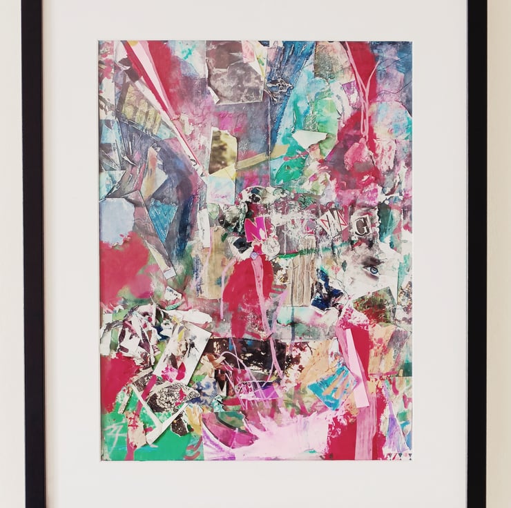 This is a mixed media expressive, abstract collage/painting. I created this using a variety of different collage papers, paint, chalk pastel, found imagery I have collected, which would have otherwise been discarded, reusing and recycling materials is a very important aspect of my process.