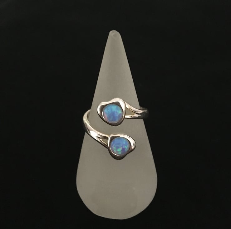 Gorgeous twin heart adjustable silver tone ring with faux opals