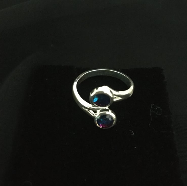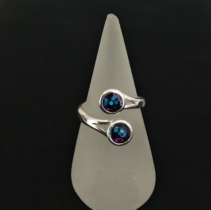 A lovely ring with 2 beautiful tri-colour resin centres which makes it really stand out.