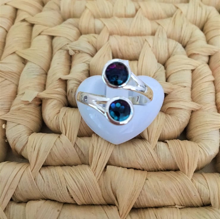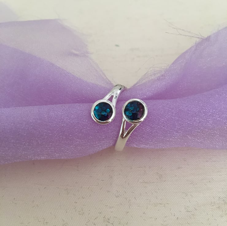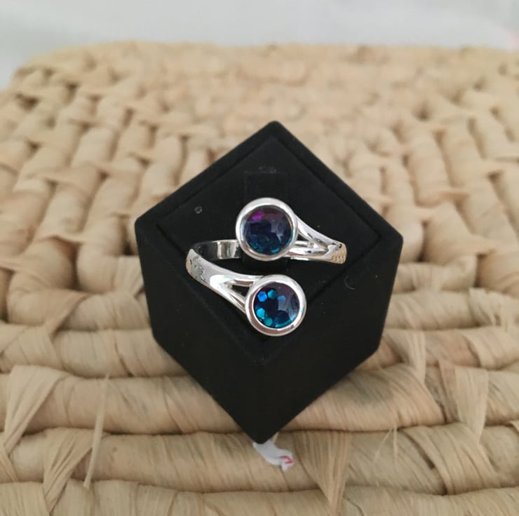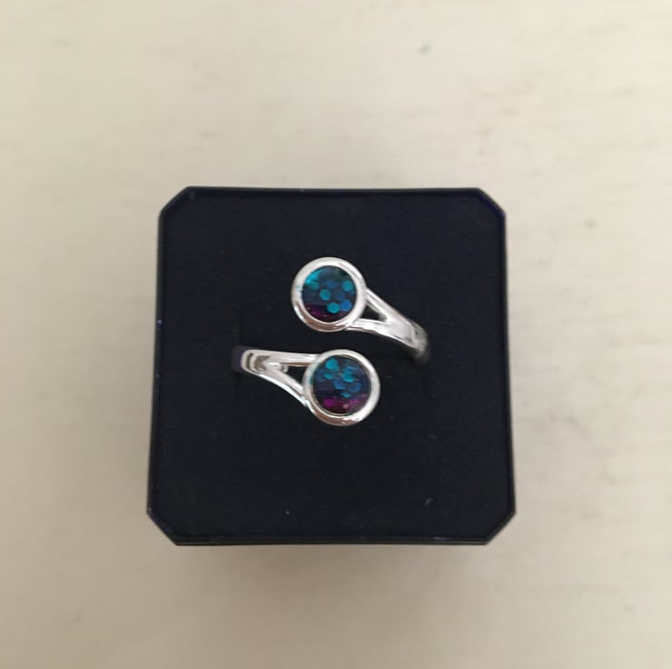 A lovely ring with 2 beautiful tri-colour resin centres which makes it really stand out.