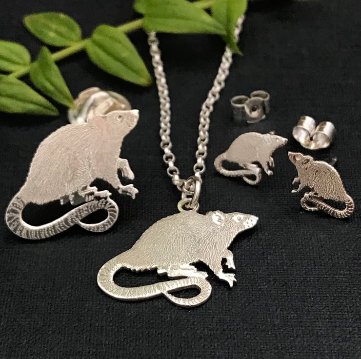 Each rat pendant measures approximately 20mm nose to tail and 15mm from the top of his head to tail.