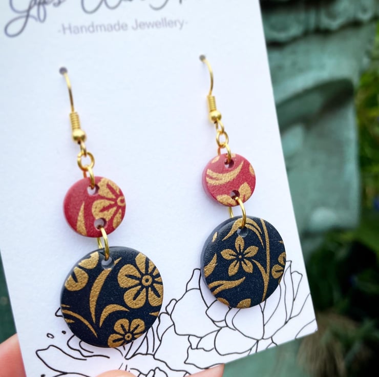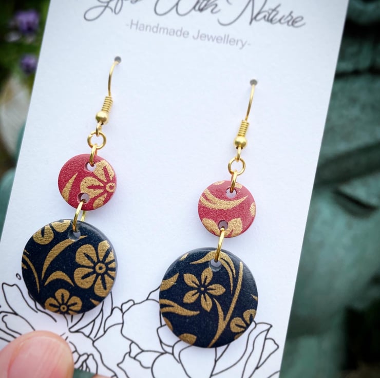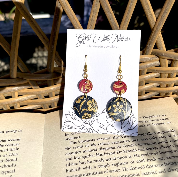 Elevate your style with beautiful handmade polymer clay earrings, crafted with love and care by me. Each pair is unique, and this particular design features a beautiful blend of red and black polymer clay with gold floral pattern creating a striking contrast that's perfect for any occasion.