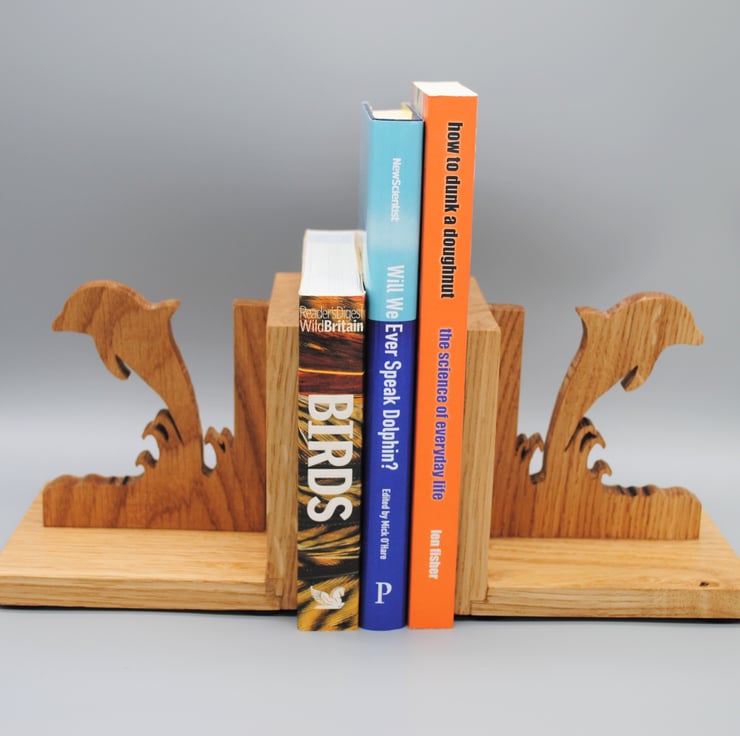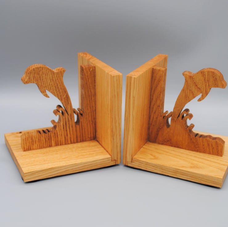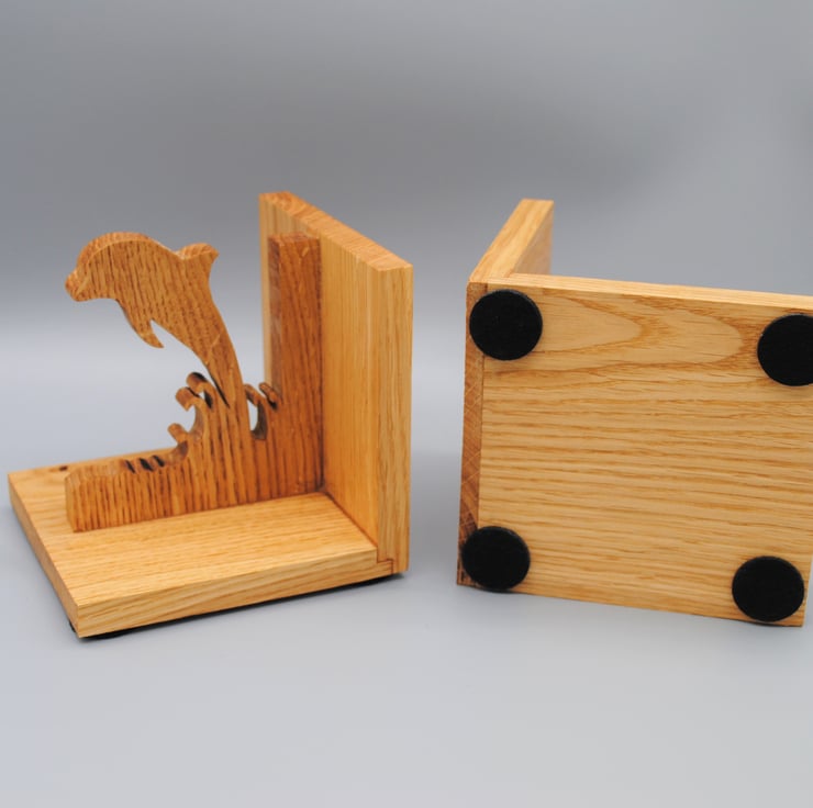 These decorative bookends are ideal for small and medium weight items, perfect for the home, study, or office. Made from solid oak and finished in Danish Oil to bring out the natural grain of the wood. The design has been cut using a scroll saw.