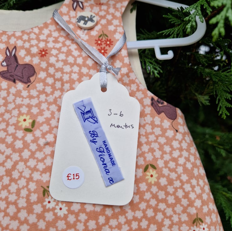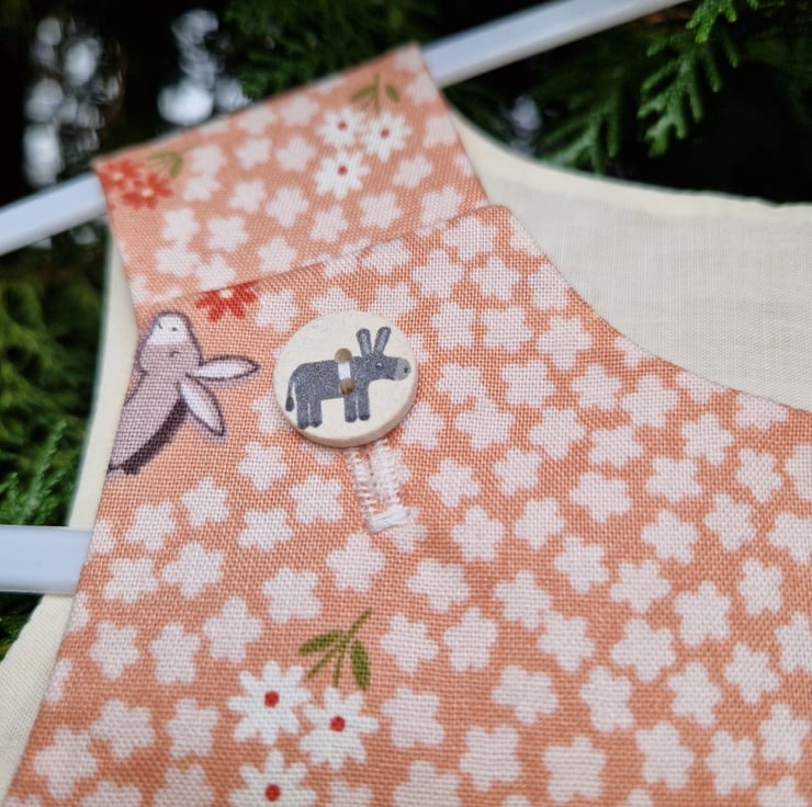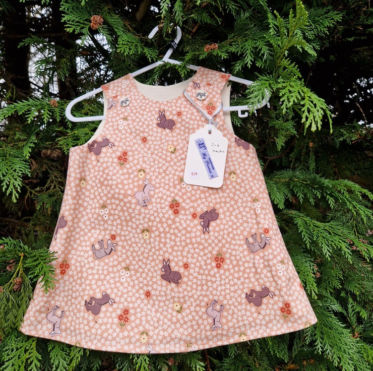 A fully lined A-line dress made from a peach cotton fabric with a print of mixed coloured donkeys and daisy shaped flowers and with round donkey buttons. Can be worn with tights and a long or short sleeve T shirt underneath and cardigan on top.