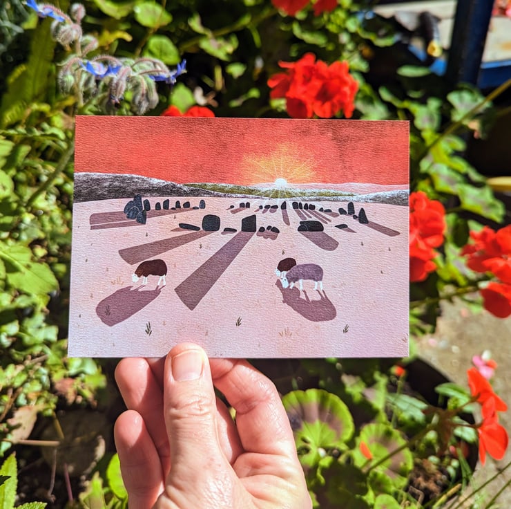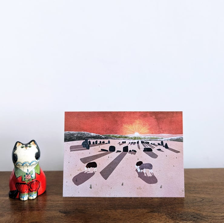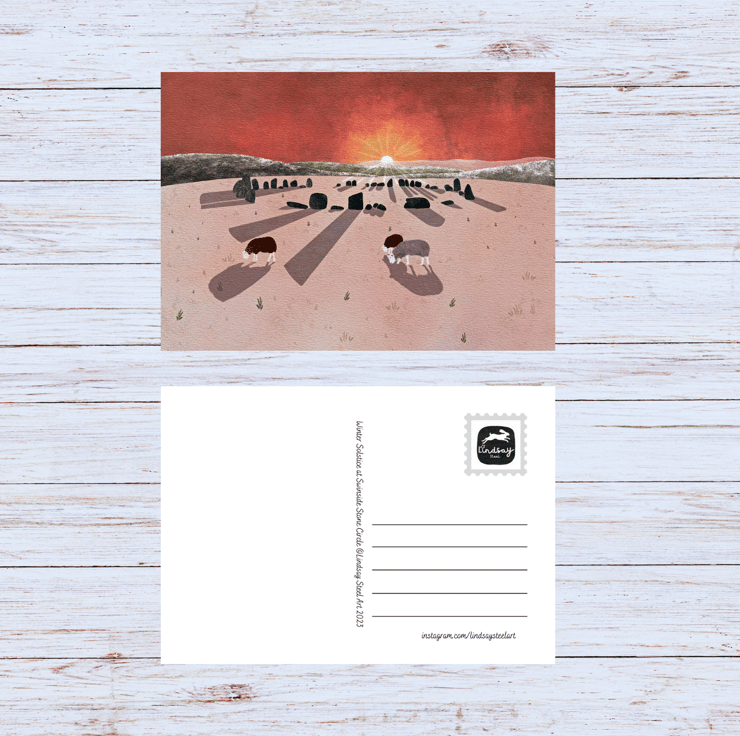 A6 postcard of my digital illustration of the sun rising on the winter solstice at Swinside stone circle in Cumbria.