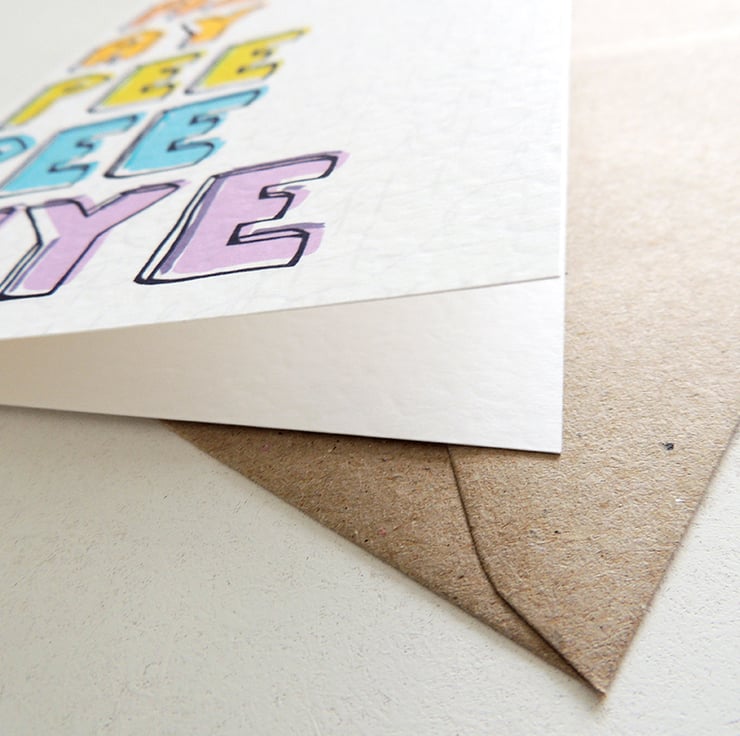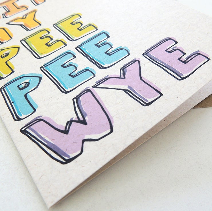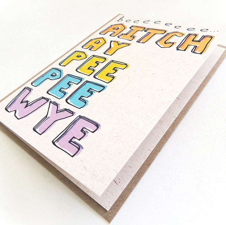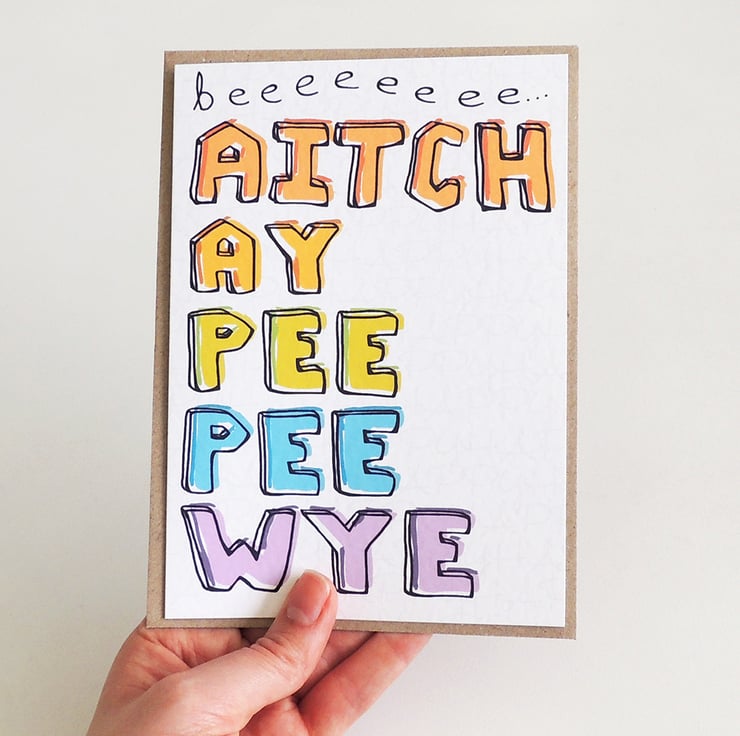 This fun card reads "beeeeeee AITCH AY PEE PEE WYE" in hand-illustrated lettering on the front, and is perfect for wishing someone well in their next adventure; whether that is retirement, marriage or something else!