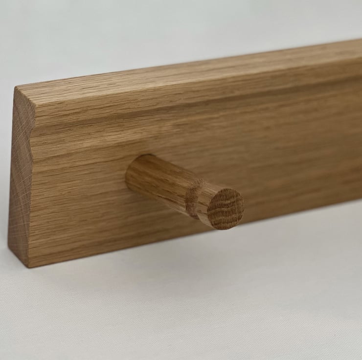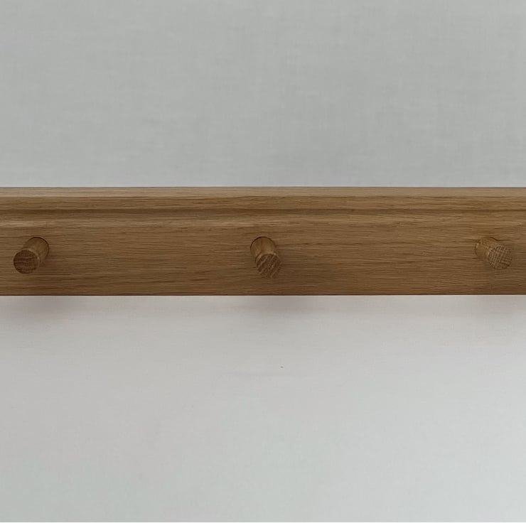 Handmade in British oak, our peg rails come in 3, 5, 7 or 9 pegs. Beautifully simple and elegant with considered detailing, hidden screws and angled pegs.