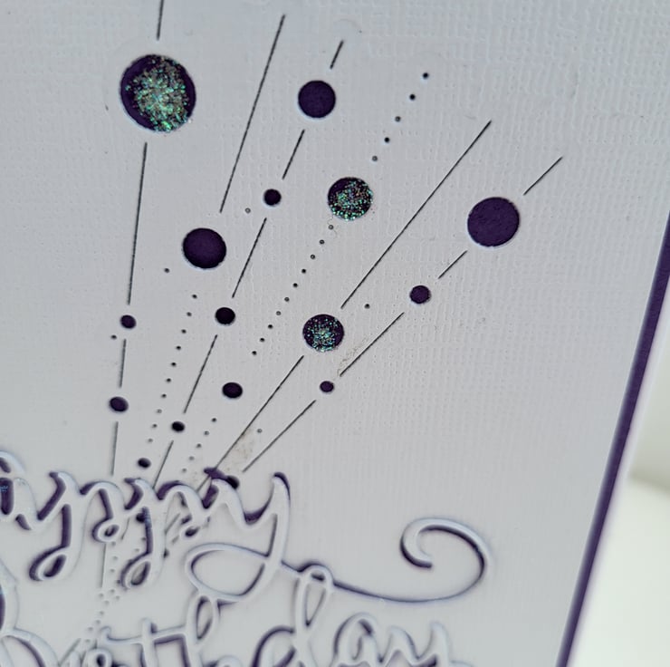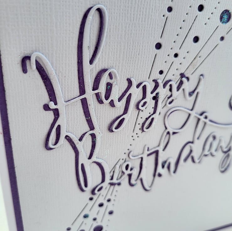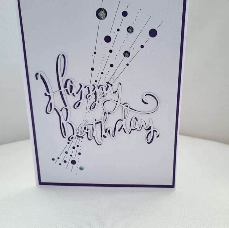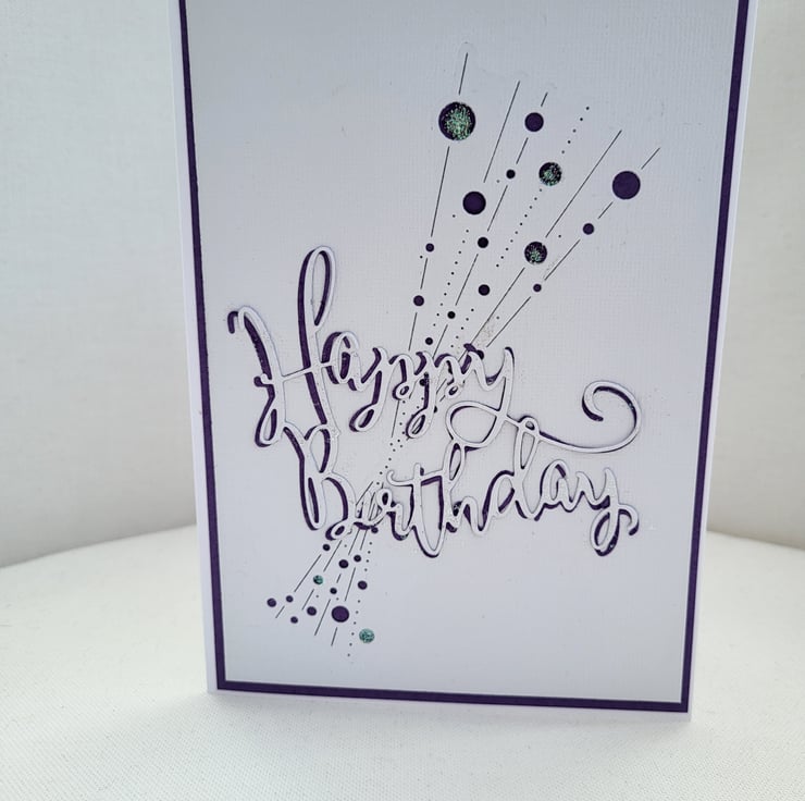 Beautiful handmade Birthday card which is suitable for all ages. The card measures 5 x 7 inch approx. It is on linen effect card and has a light purple background. The happy birthday sentiment has been cut out of the card and placed to create a drop shadow. There is a tiny bit of glitter over the card to add some sparkle. This card has been left blank inside for you to add your own message.