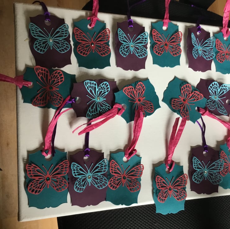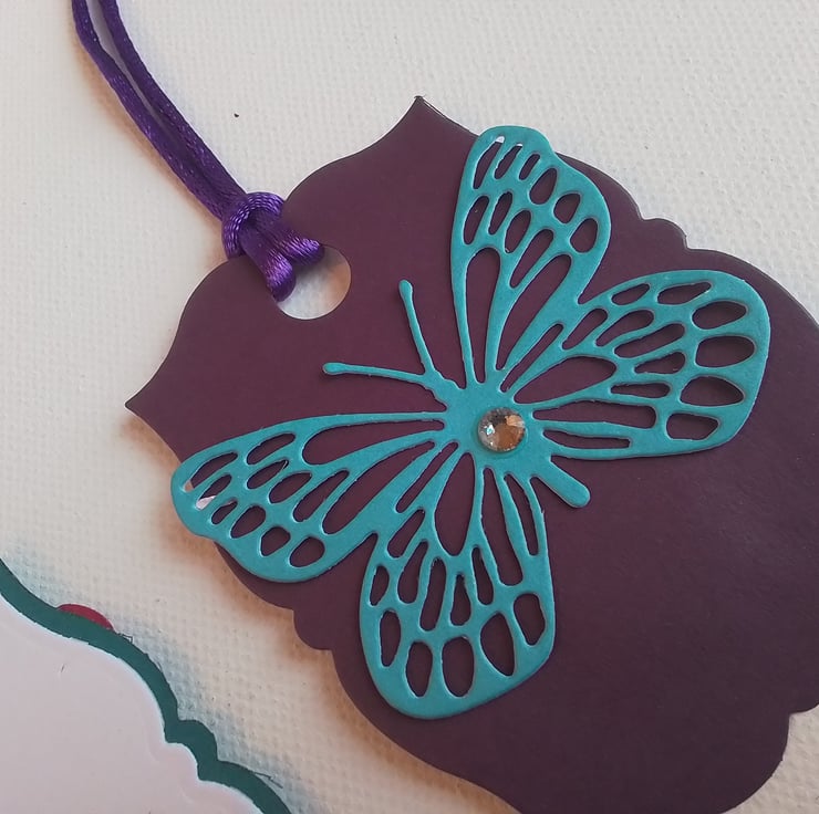 A set of 3 butterfly gift tags which are in beautiful shades of aubergine with pale blue butterfly and teal with pink butterfly.