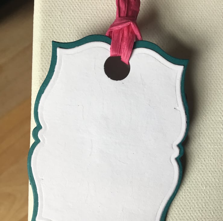 The aubergine tags have a purple ribbon and the teal ones have pink raffia.