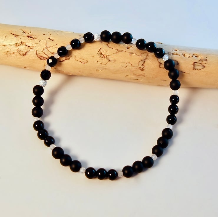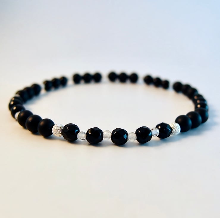 The white and silver beads contrast well with the black of Onyx beads, and add a subtle sparkle to the piece.