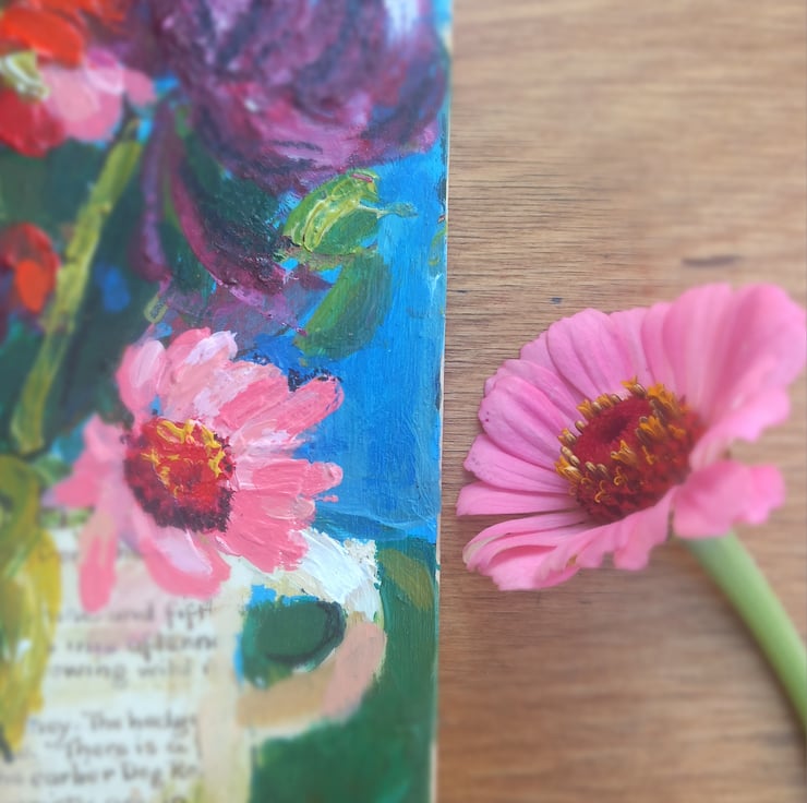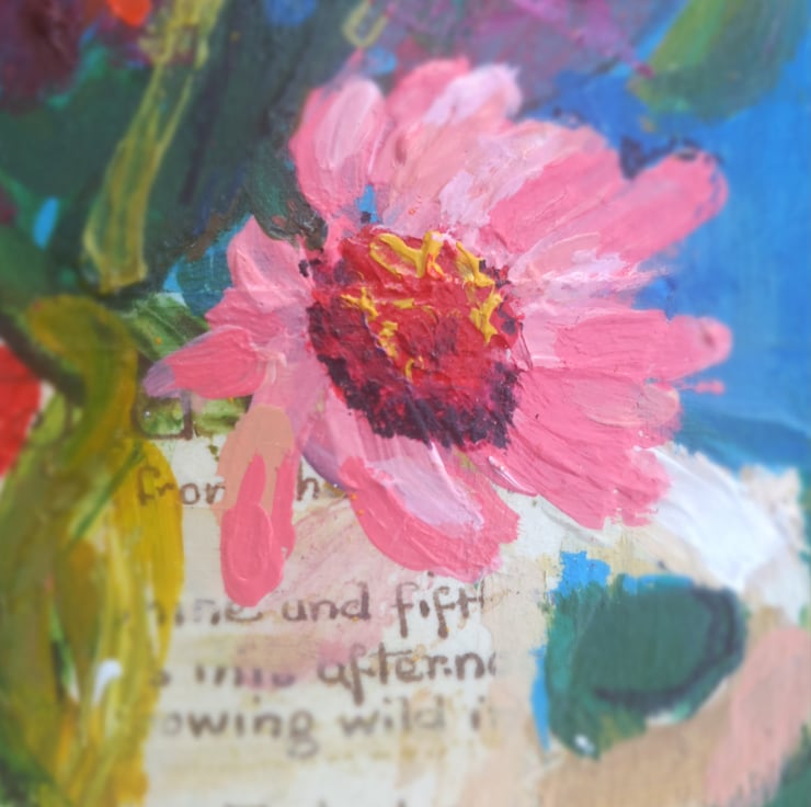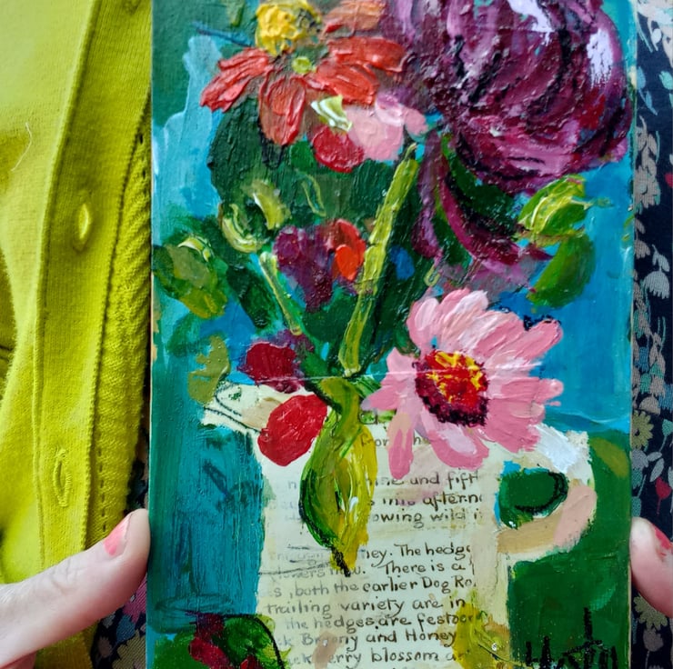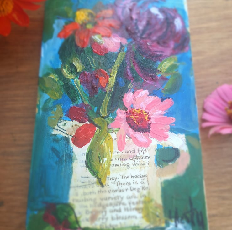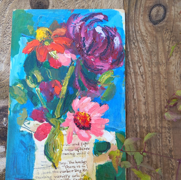 These cheerful flower are painted on reclaimed wood which is part of its charm. A contemporary, naive style still life. Rich in texture and measuring 20 cm tall. In my signature style , loose and full of movement and feeling .mixed media using paper on the jug collage . Lightly varnished and ready to hang xxp