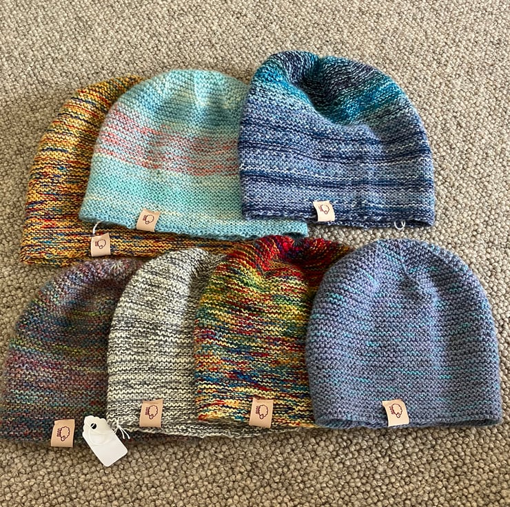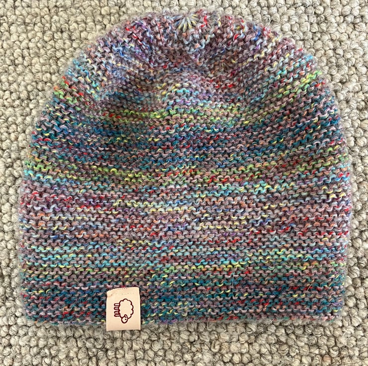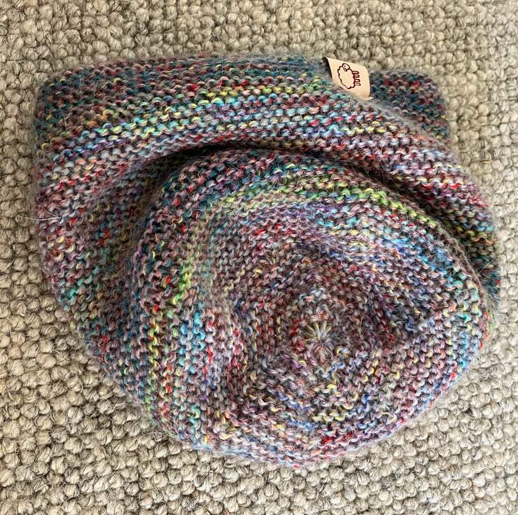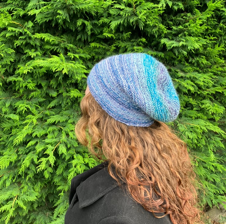 Luxury yarn fine knit slouch hat. Soft and warm. Each one is unique as several fine strands of natural yarn are used together. Wool, silk, alpaca, cotton are some of the yarns used. In four sizes for a perfect fit.
