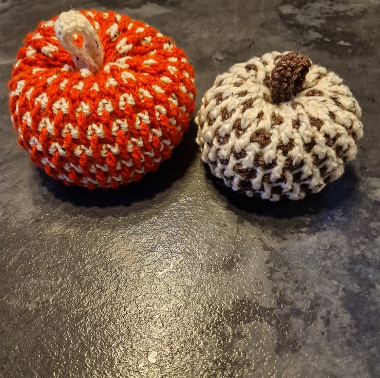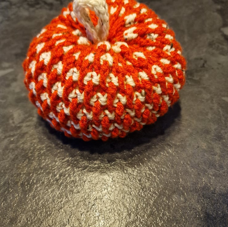 A handmade crocheted pumpkin in Acrylic yarn. Medium sized approx 16cm x 12cm in either orange/cream, cream/orange or cream/brown or brown/cream. The cream colour is called Glendon & is Aran Tweed. Please DM me stating what main colour you would like. This pattern is by ‘OhMeOhMy crochet’ and is called the Alpine Pumpkin