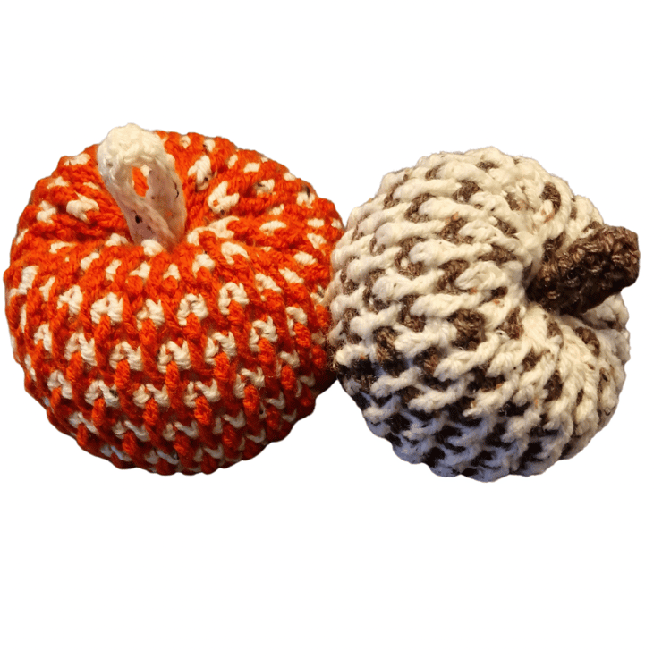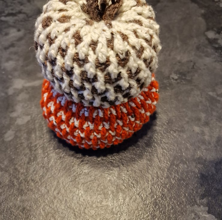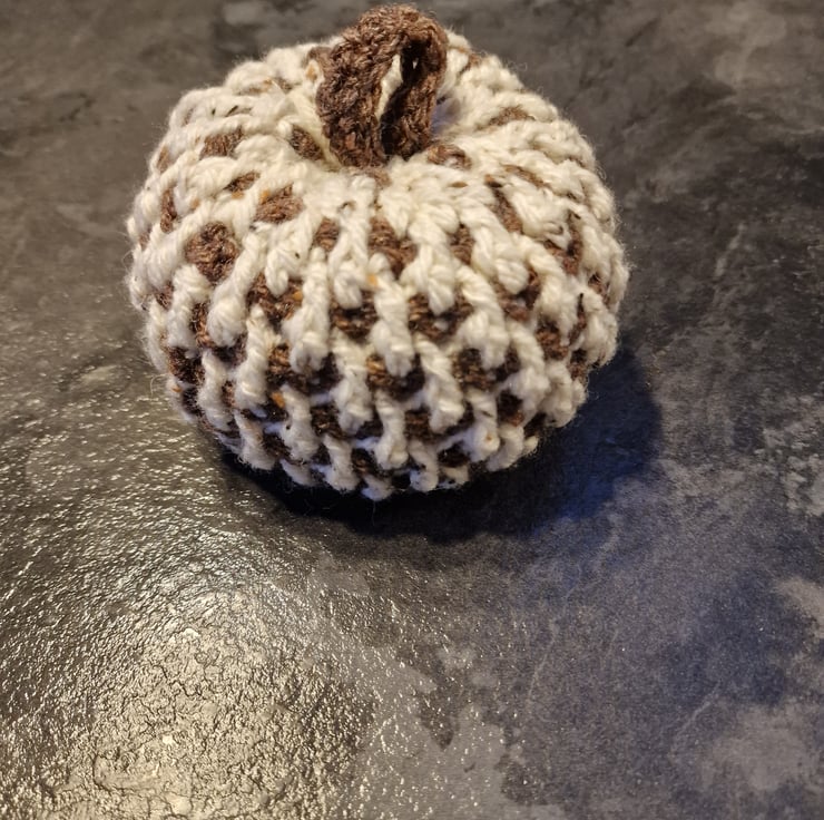 A handmade crocheted pumpkin in acrylic & Aran tweed yarn. Small sized approx 12cm x 10cm in brown/cream or cream/brown & orange/cream or cream/orange. Both yarns are Aran tweed. Please DM me stating what main colour you would like. This pattern is by ‘OhMeOhMy crochet’ and is called the Alpine Pumpkin.