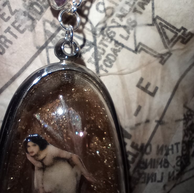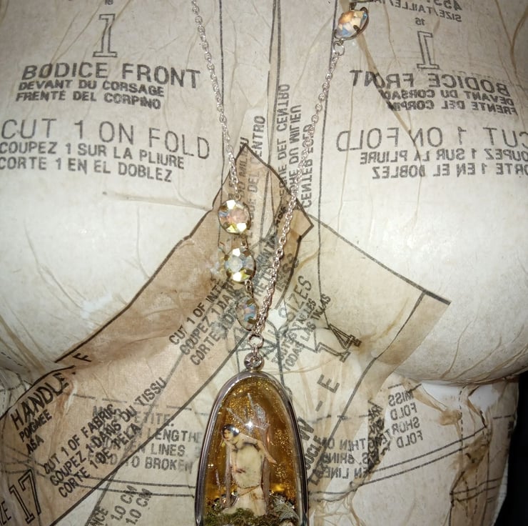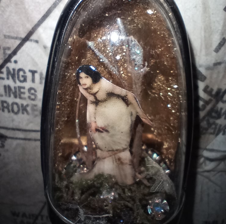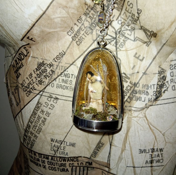 I have used a 6cm tall shadow box with an acrylic done and metal surround. Inside I have added a floor of moss, skeleton leaves, diamantes and branches all with hints of ab glitter. Wandering through the woodland scene is an image of a medieval looking lady by the artist Waterhouse, all against a gold leaf and glitter background.