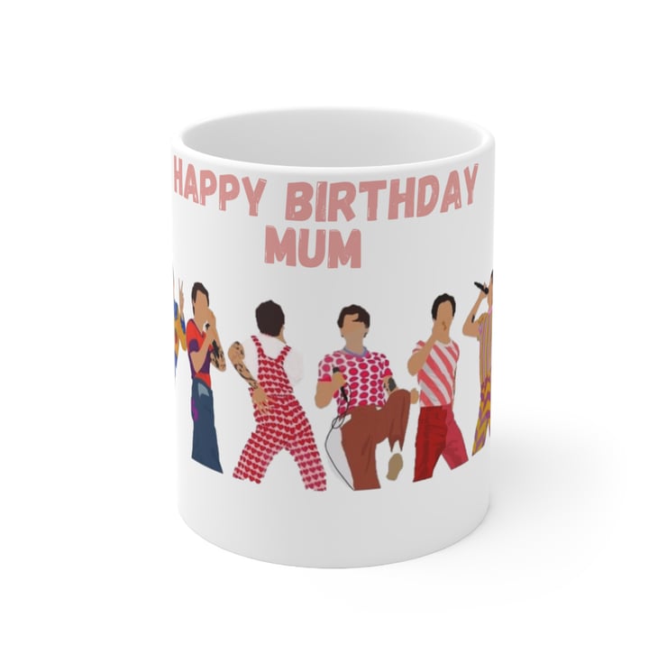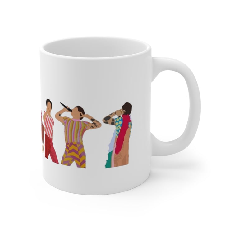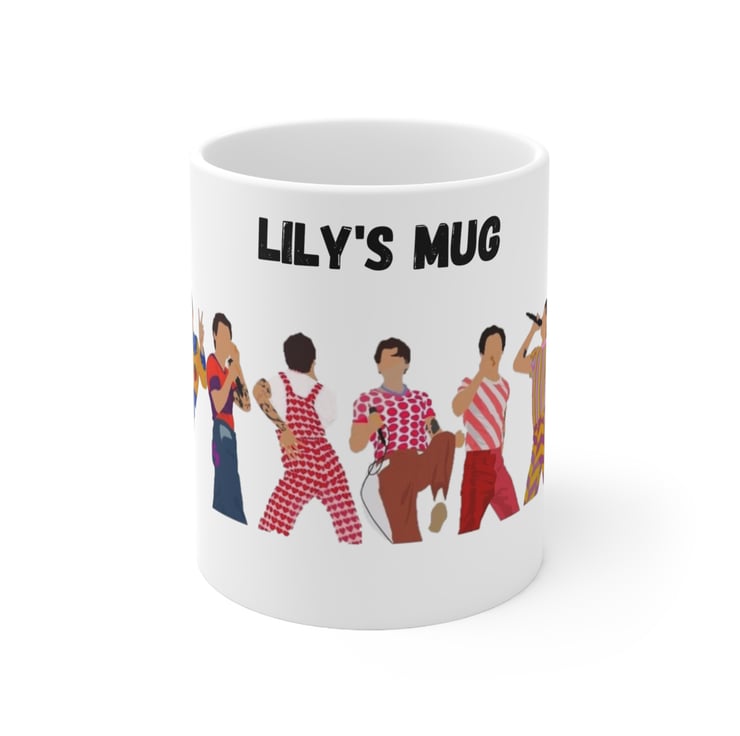 Standard 11oz coffee mug featuring Harry Styles, can be personalised to include any message you want, simply write message in box provided with colour of font you'd like to see in brackets for eg. 'Lily's Mug (Pink)