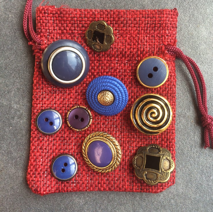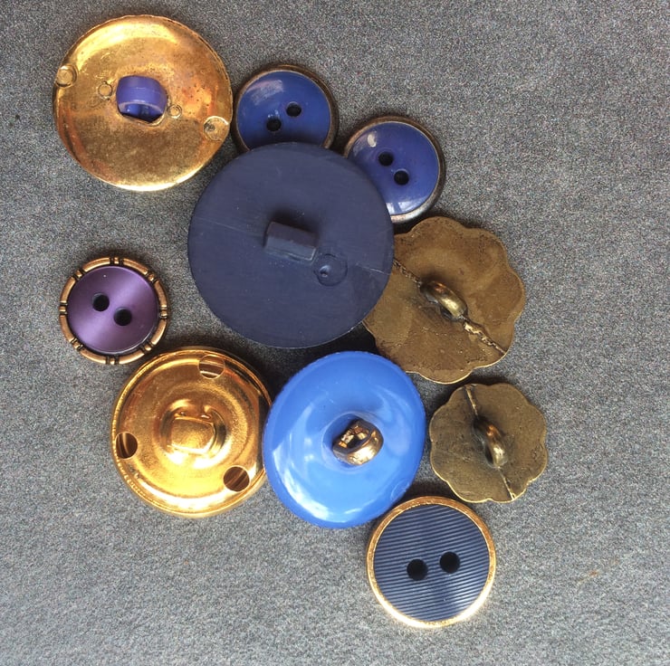 Assortment of 10 blue buttons. 5mm-20mm across.