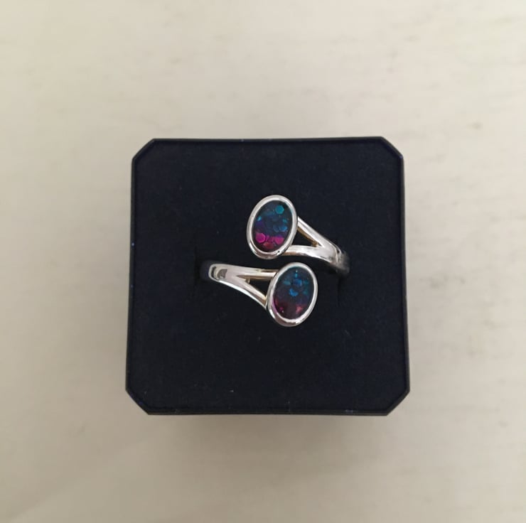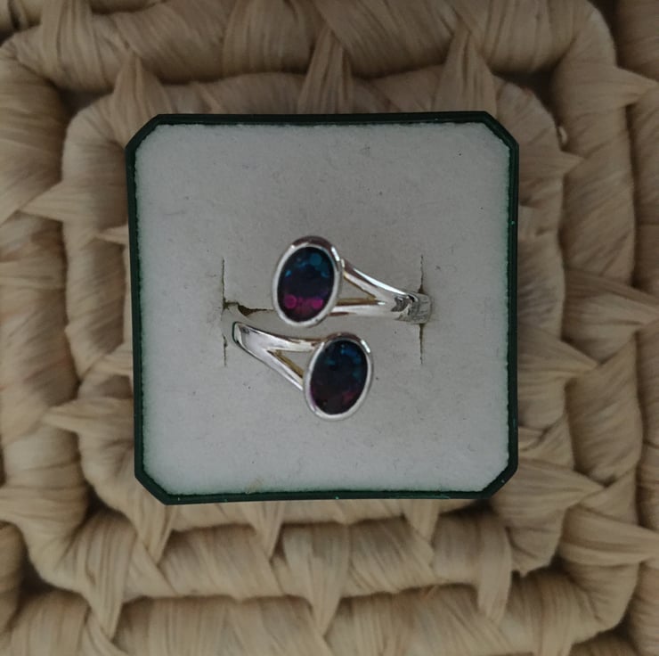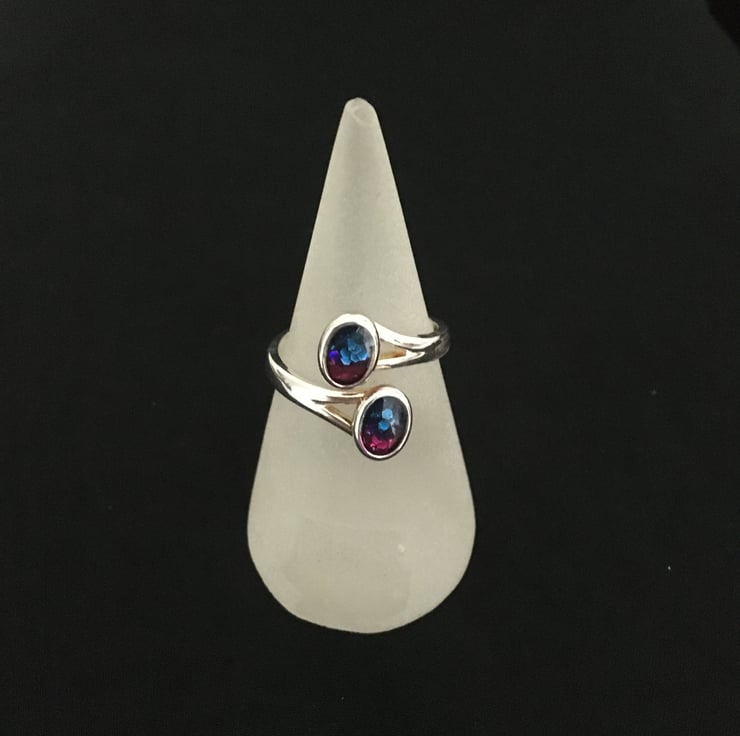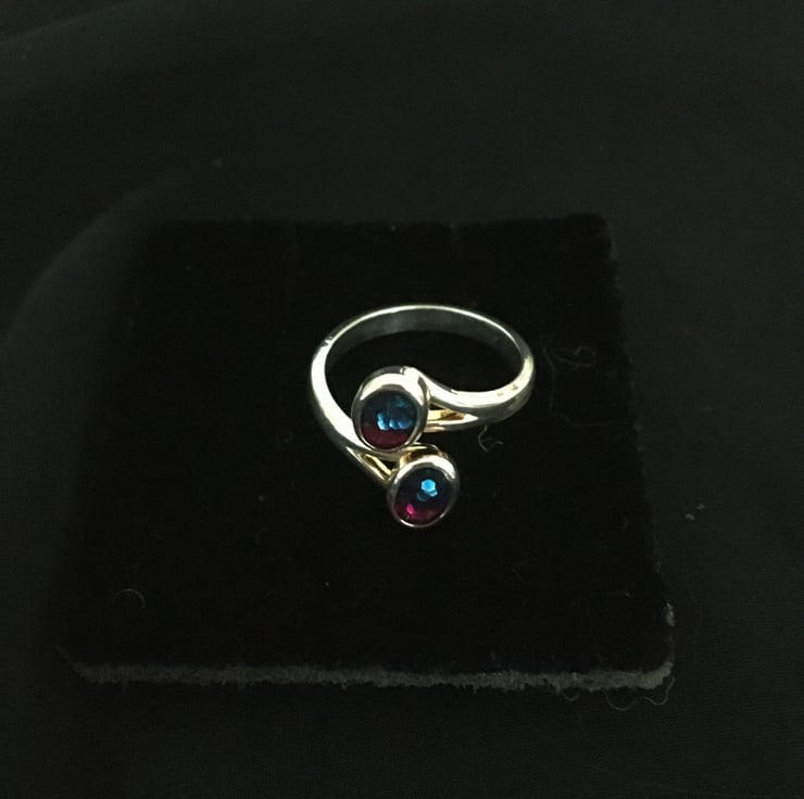 A lovely ring with tri-coloured double centres, the colour mix gives catches the light with a gentle understated shine.