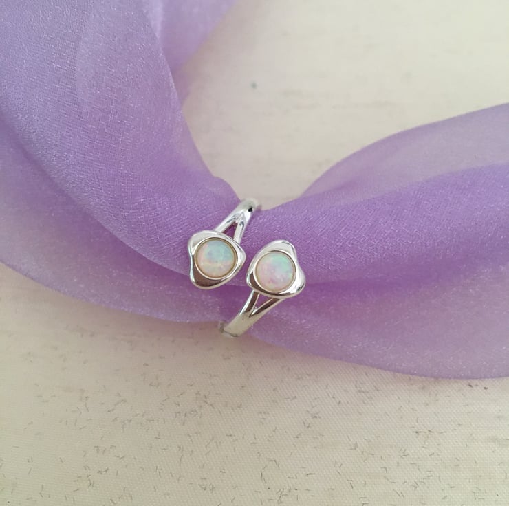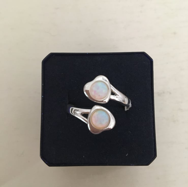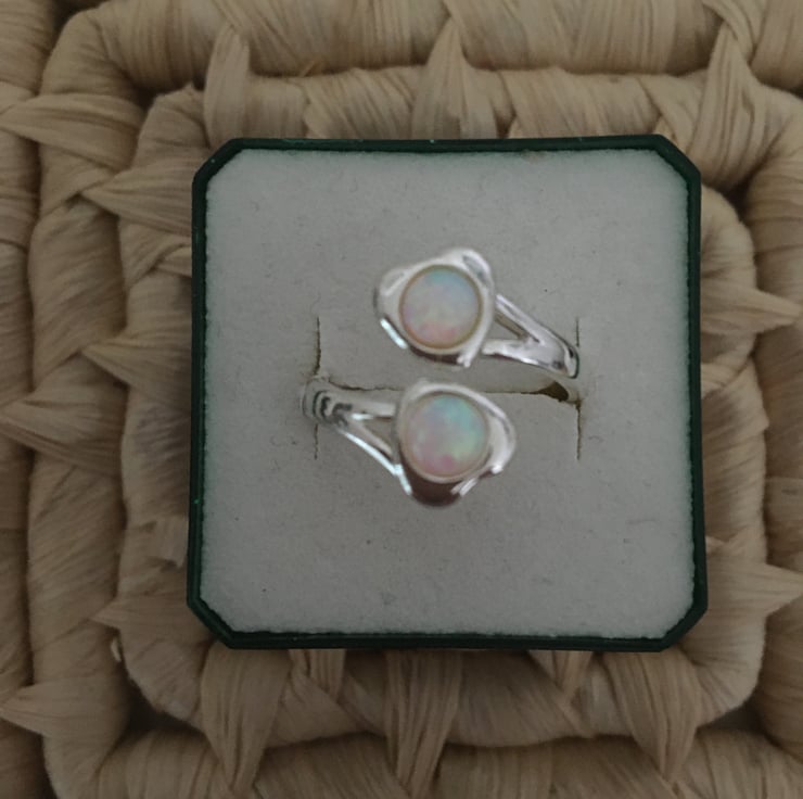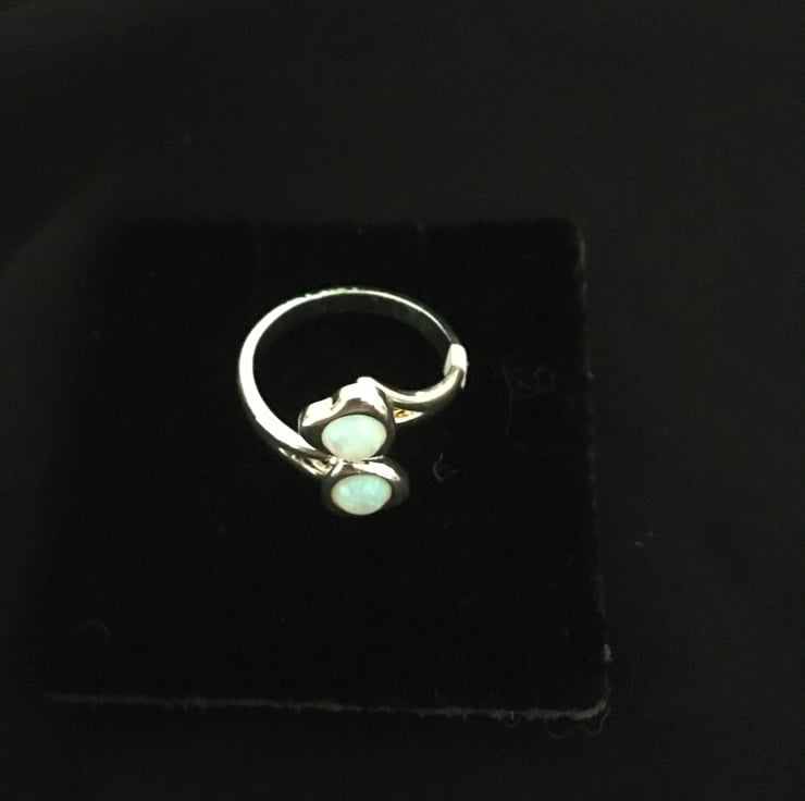 A lovely ring with 2 beautiful white fire opals with red and green highlights that catch the light and make it shimmer.