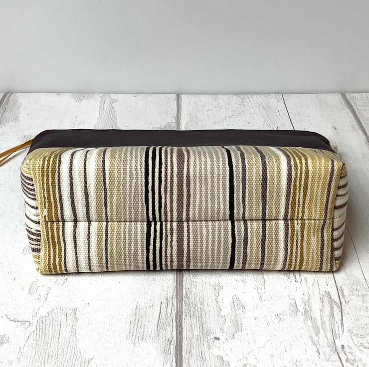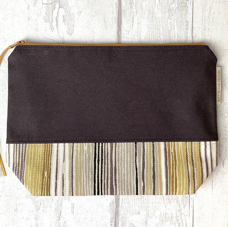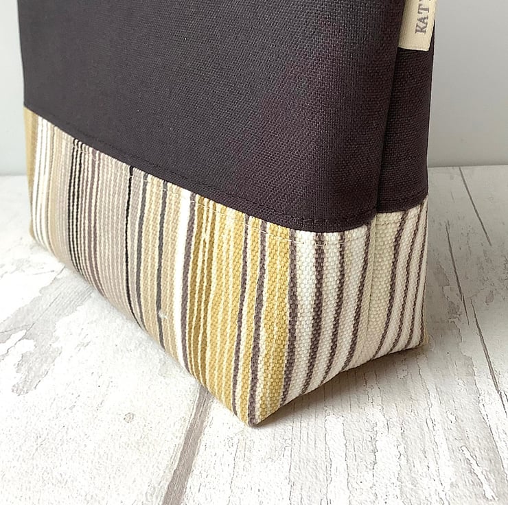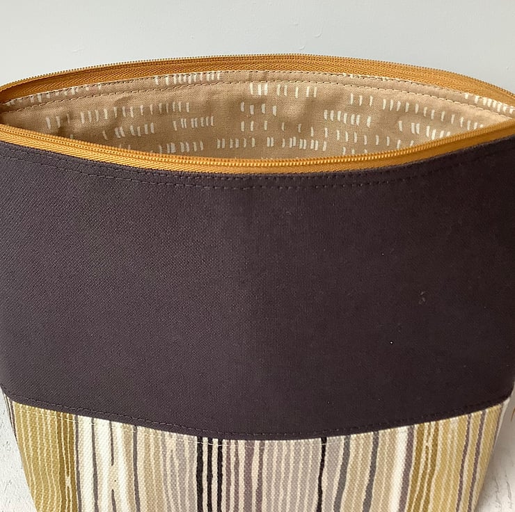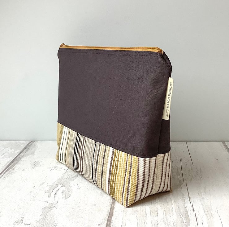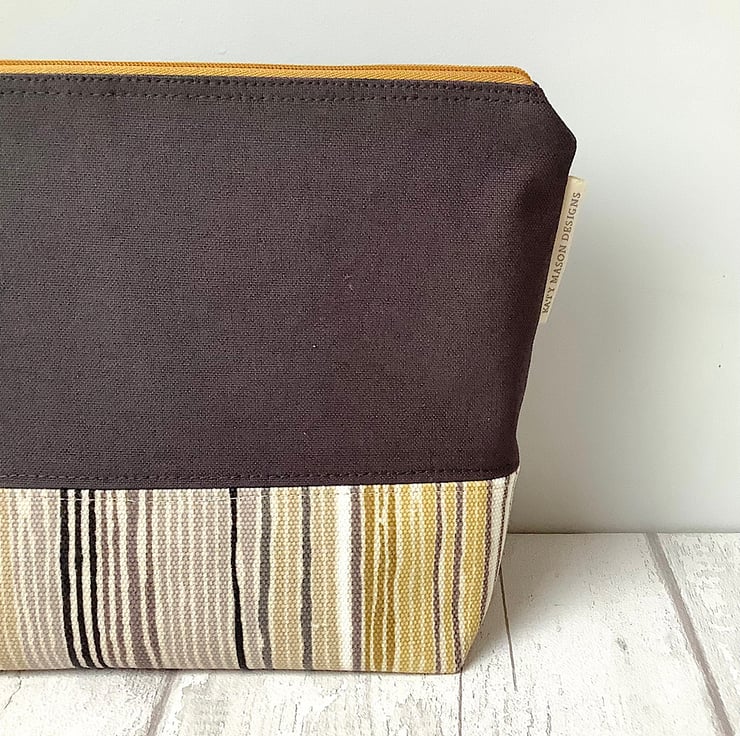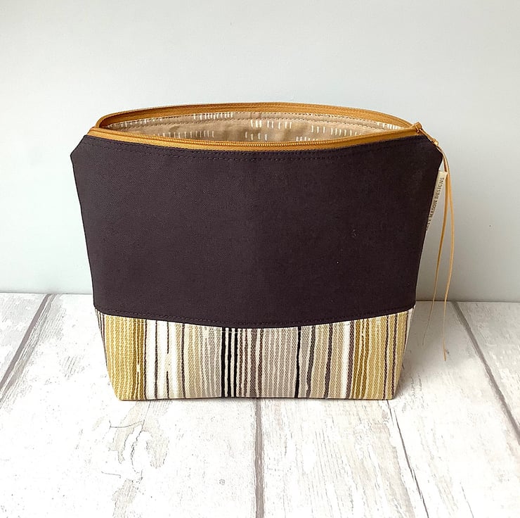 Brown and mustard cosmetic bag. Brown canvas and stripe fabrics. Lined in beige print cotton with a mustard zip. 26cm wide, 19cm high, 8cm deep at base.