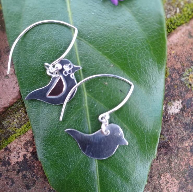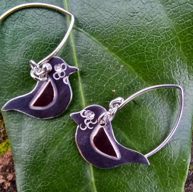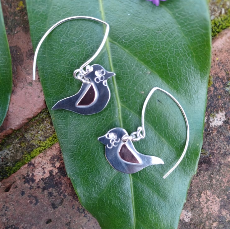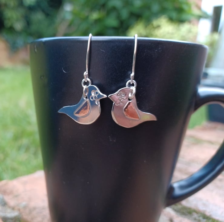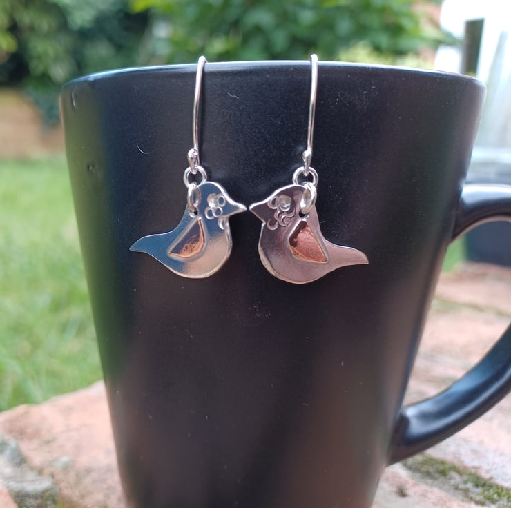 Cute sterling silver and copper birdie earrings hung from handmade sterling silver ear wires. The birds are 1.4cm by 2.4cm. The earrings measure 3.25cm from the top of the ear wires.