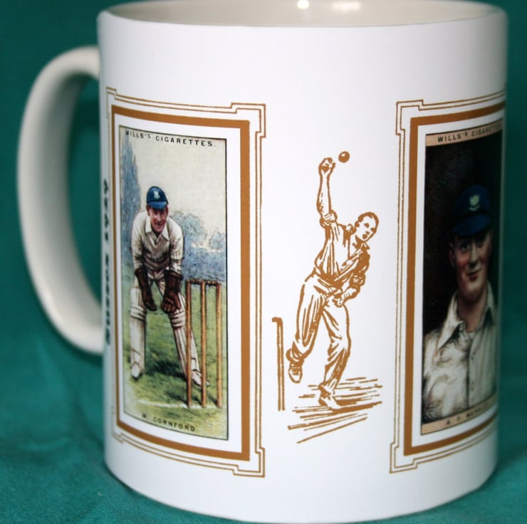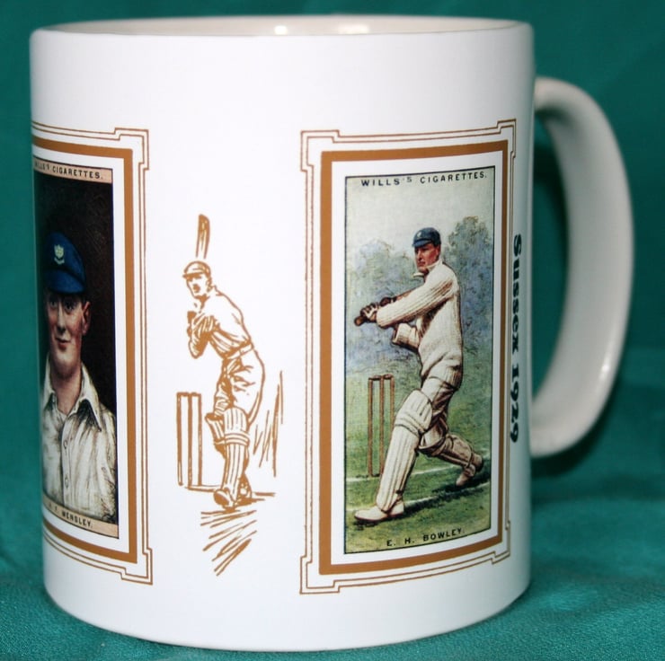 Cricket mug Sussex 1929 cricket counties W Cornford A F Wensley & E H Bowley vintage design mug