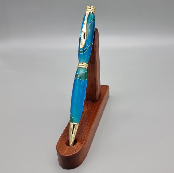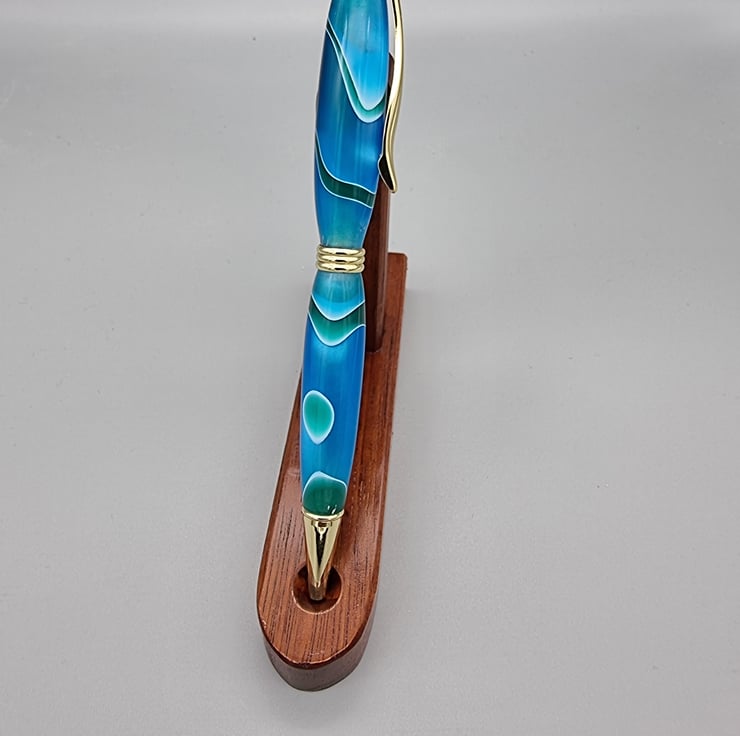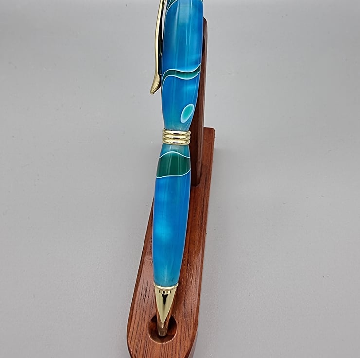 This European style pen is created from “blue marble effect acrylic” and Has a lovely grain which is highlighted by the gold features.
