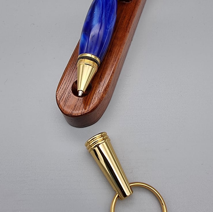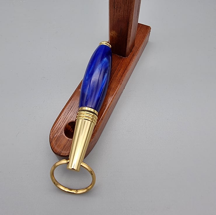 This pen keyring is created from “Blue marble effect acrylic” and Has a lovely grain which is highlighted by the gold features.